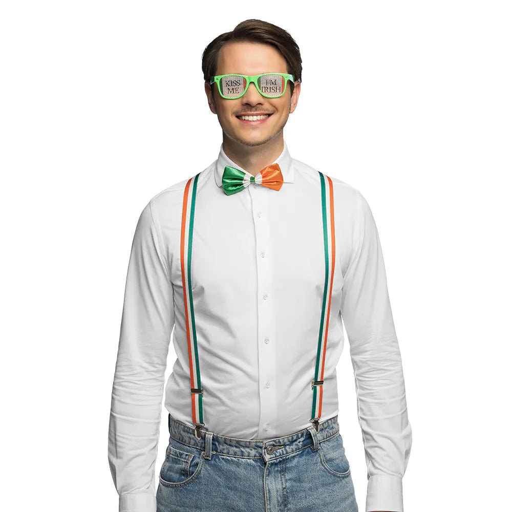 Vier St. Patricks Day in stijl met deze complete accessoireset! De bril, bretels en strik in Ierse kleuren maken jouw outfit helemaal feestklaar. Kiss me, I'm Irish!