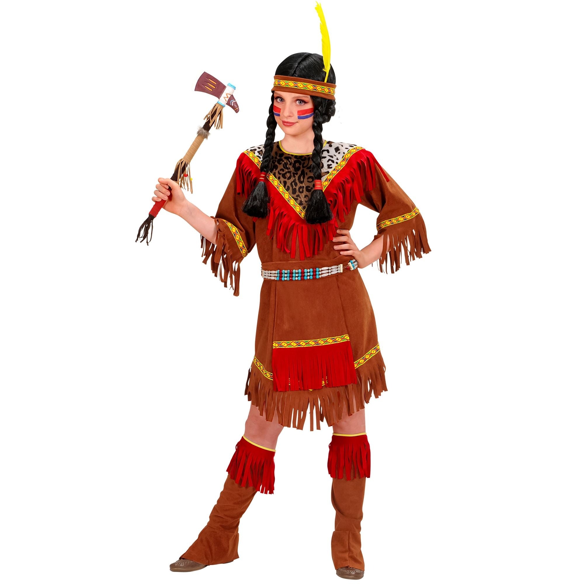 Omschrijving: indiaans meisjesjurkje, schort, laarsbeschermers, hoofdband met veer