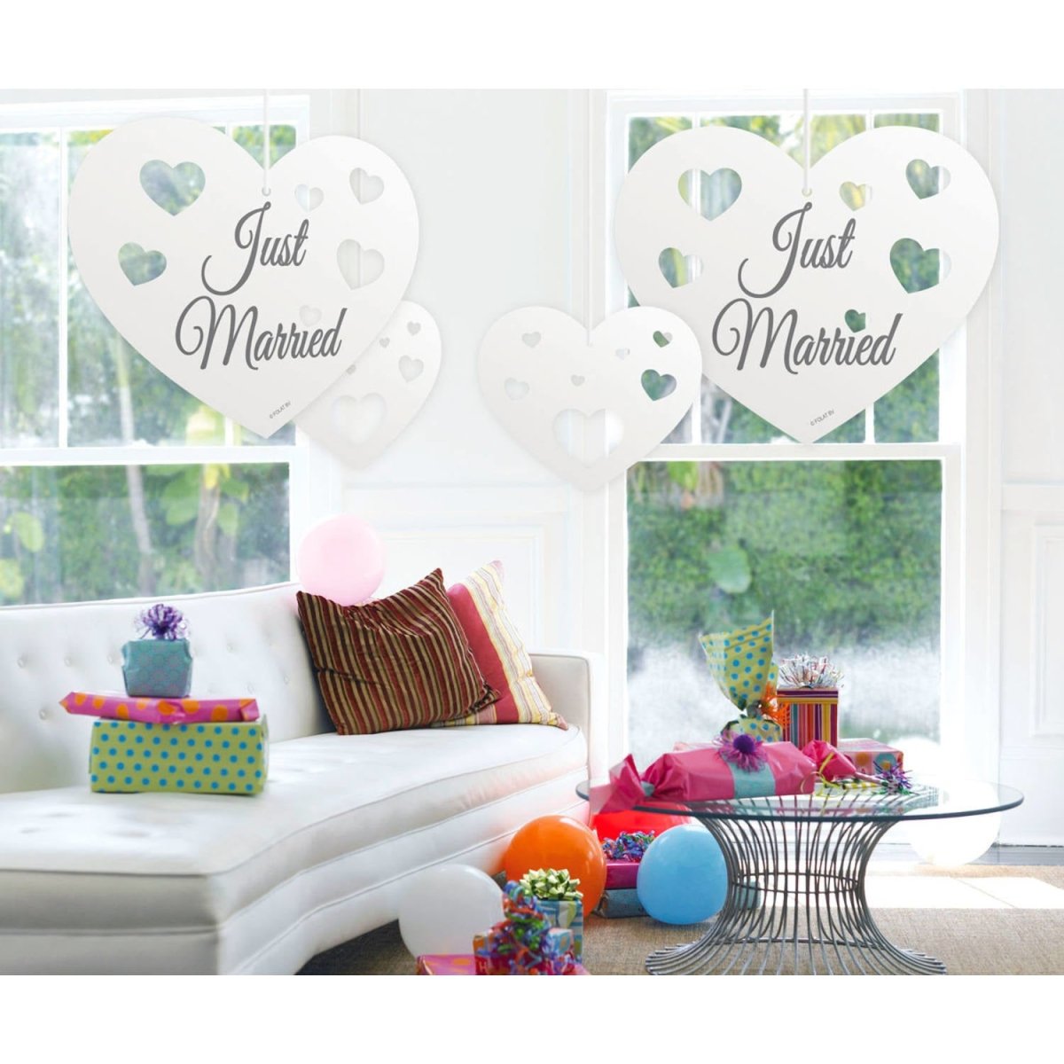 Hangdecoratie harten Just Married - 5 stuks. Inhoud: 5 stuks hangdecoratie. Bijvoorbeeld te gebruiken tijdens de volgende feestgelegenheid/feestgelegenheden: Bruiloft. Lengte van het artikel: 75 cm. Het artikel is gemaakt van papier.