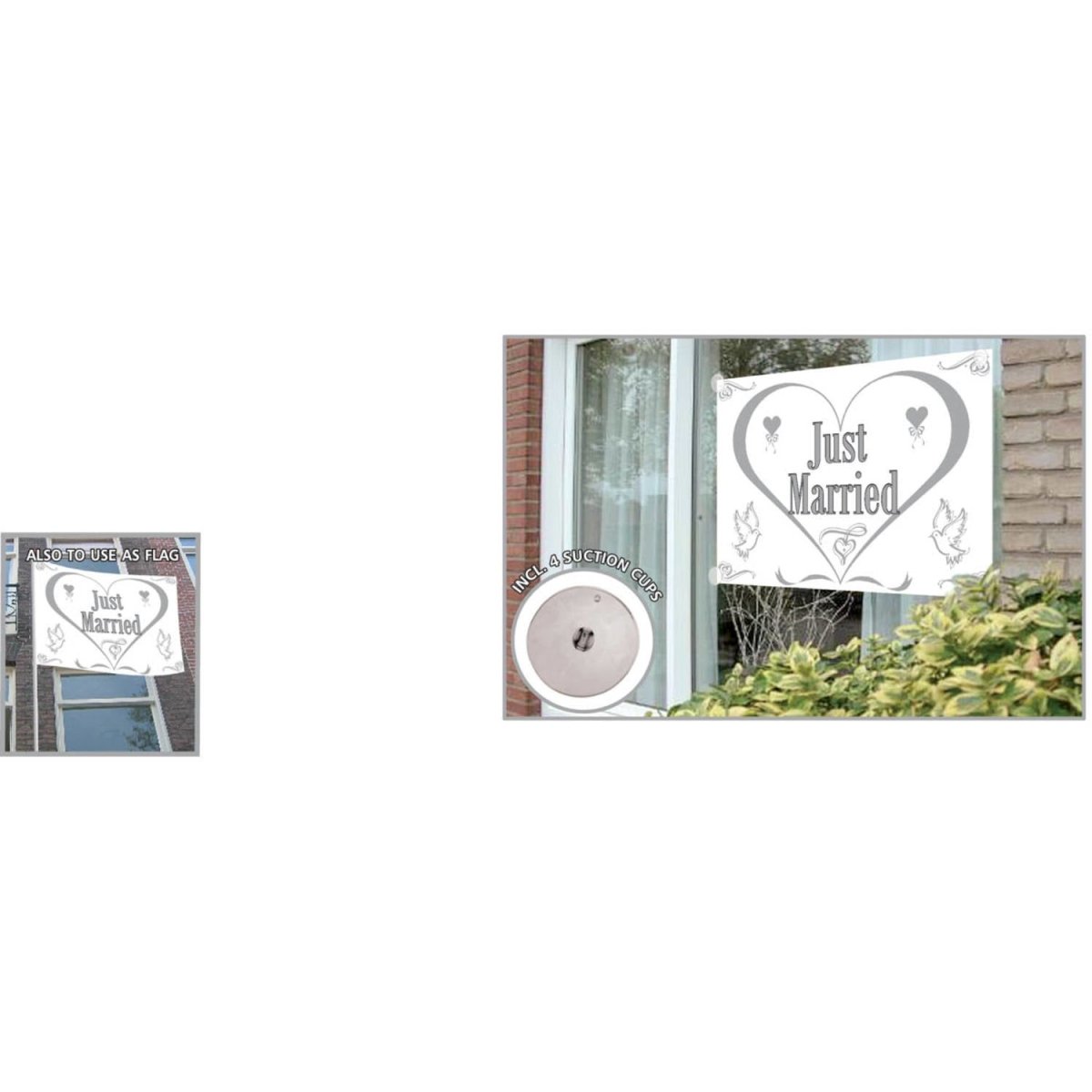 Gevelvlag Just Married 100x150cm. Inhoud: 1 vlag. Bijvoorbeeld te gebruiken tijdens de volgende feestgelegenheid/feestgelegenheden: Bruiloft. Het artikel is 100x50cm. Het artikel is gemaakt van polyester.