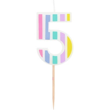 Kaars Pastel Cijfer 5 Meerkleurig. Inhoud: 1 kaars. Kleur: Meerkleurig. Bijvoorbeeld te gebruiken tijdens de volgende feestgelegenheid/feestgelegenheden: Verjaardag, Kinderfeestje en Jubileum. Deze kaars is ongeveer 5 cm groot. Het artikel is gemaakt van wax.