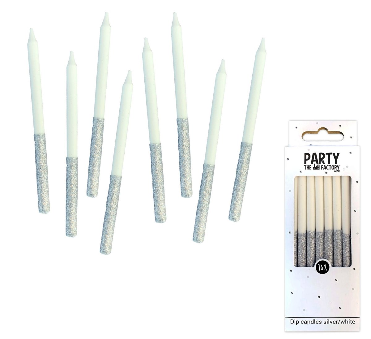Kaarsjes Glitter Dip Wit Zilver 8cm 16st