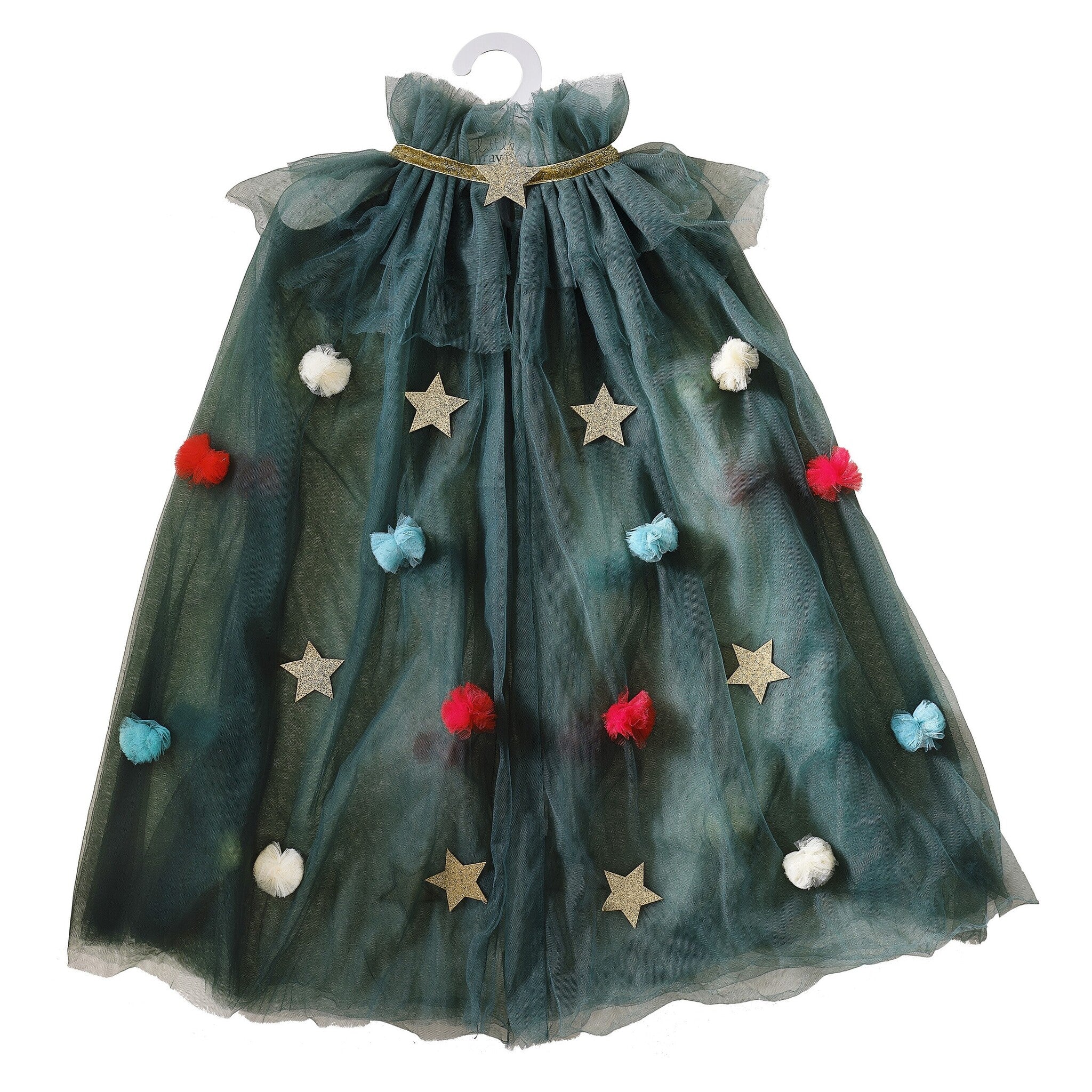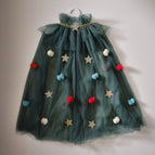 Deze prachtige cape is gemaakt van bosgroene tule met rode, blauwe en crèmekleurige pomponversieringen van tule en gouden glittersterren.