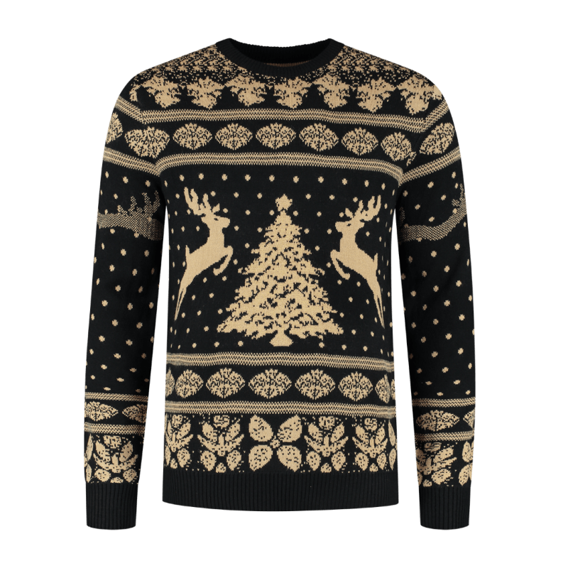 Deze Jumping Reindeer kersttrui combineert een moderne look met een feestelijk tintje. De trui is uitgevoerd in zwart en versierd met een stijlvol goudkleurig rendiermotief, waardoor hij een luxe en toch speelse uitstraling heeft. Perfect voor wie een feestelijke trui wil die nét wat chiquer oogt dan de klassieke kerstprints.