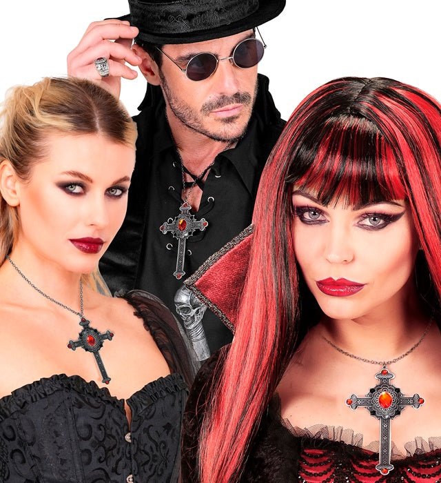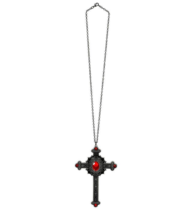 Deze opvallende ketting met kruis en rode juwelen is de perfecte accessoire voor Carnaval of Halloween. Ideaal om een gotische, vampier- of duistere outfit compleet te maken.
