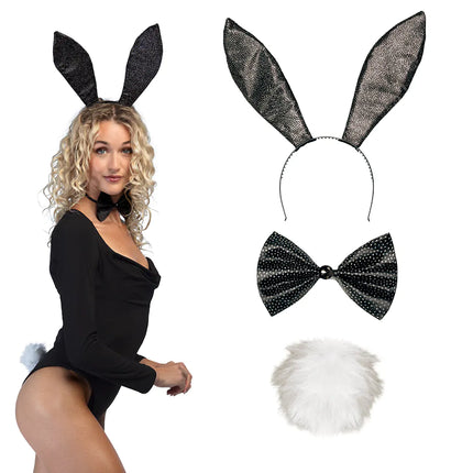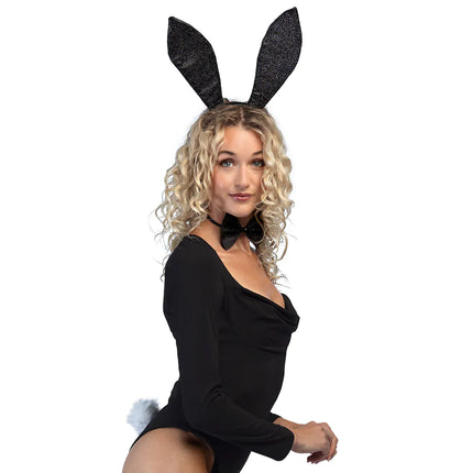 Grote zwarte konijnenoren, een fluffy staartje en een bijpassend strikje. Dit speelse en ondeugende Sparkling Bunny setje is perfect voor een sexy outfit voor een themafeest of Carnaval.