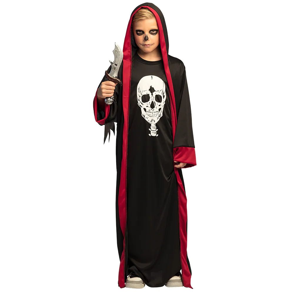 Een stoer horror kostuum voor jongens van 4-6 jaar oud. Het kinderkostuum bestaat uit een zwart gewaad met doodskop en een met zwarte cape met capuchon. Leuke outfit voor kinderen om verkleed te gaan als skelet of dungeon master tijdens Halloween.