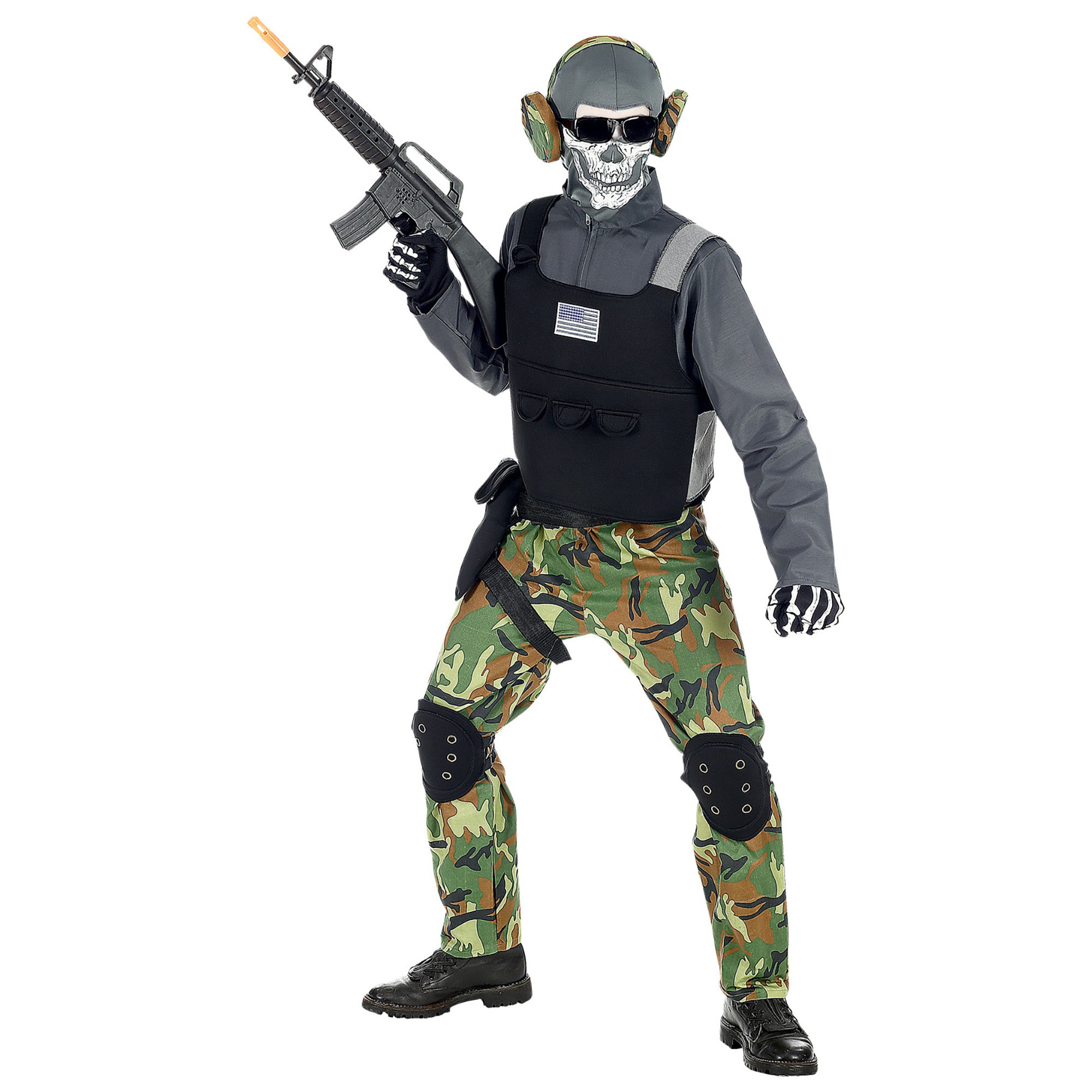 Omschrijving: skeletsoldaat overall, vest, kniebeschermers, riem, holster, masker, bril, koptelefoon