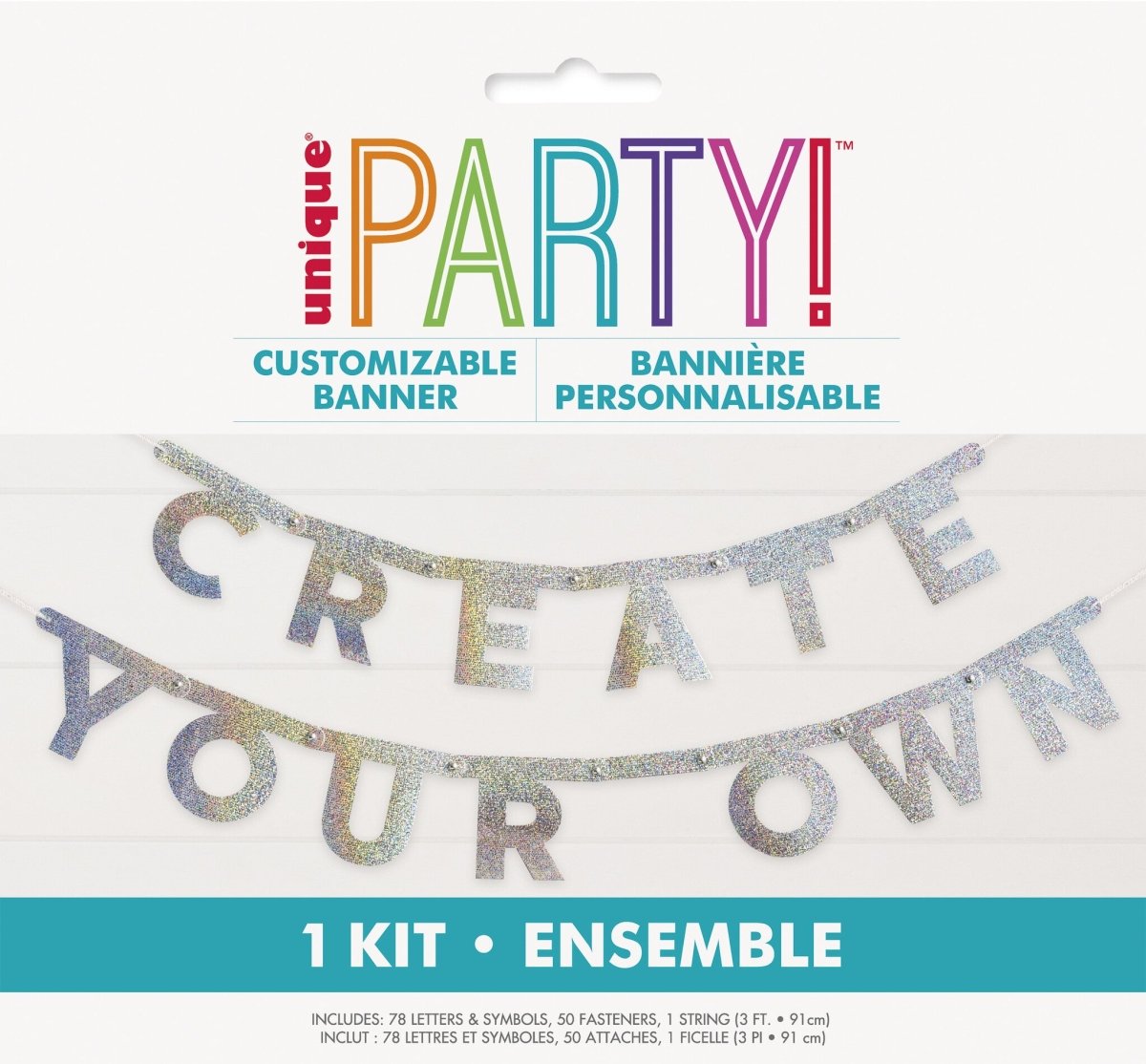 Inhoud: 78 letters en symbolen, 50 splitpennen en een koord van 91cm om de slinger mee op te hangen.
