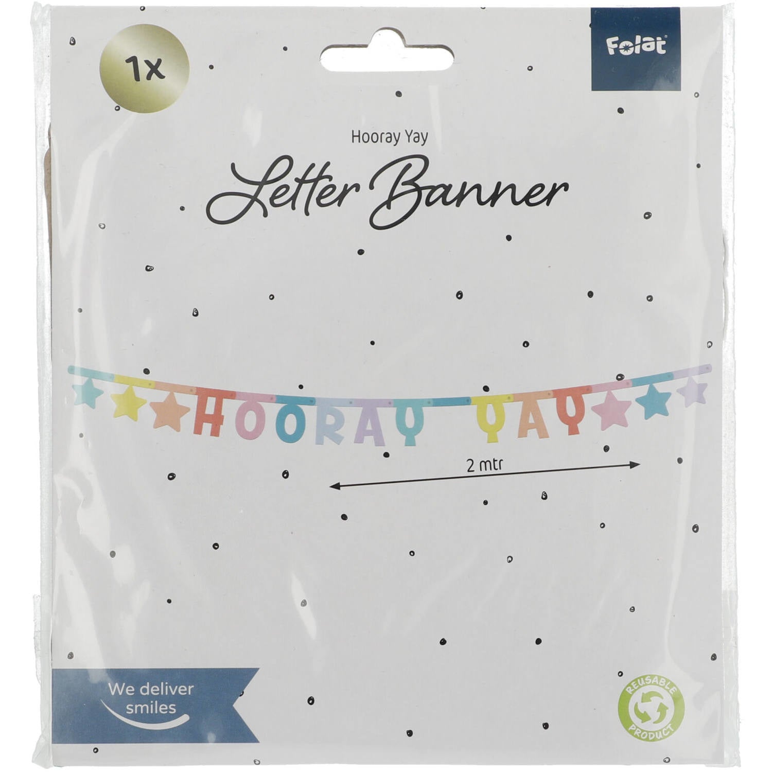 Letterslinger Hooray Yay - 1,6 meter. Inhoud: 1 letterslinger. Kleur: Meerkleurig. Bijvoorbeeld te gebruiken tijdens de volgende feestgelegenheid/feestgelegenheden: Verjaardag en Kinderfeestje. Deze slinger is 2 meter lang, waarvan 1,6 meter met letters. De letters zijn ongeveer 14 cm groot. Het artikel is gemaakt van papier.