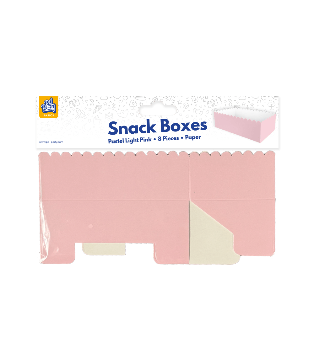 De Snack boxes - Pastel light pink zijn de perfecte items om snacks zoals popcorn en chips in te serveren op een feestje waar de kleur pastel lichtroze het thema is. Deze snack boxes zijn 7 x 7 x 12,5cm, zitten per 8 verpakt en passen perfect bij de overige pastel lichtroze artikelen zoals de confetti, servetten, bordjes, tafelkleden, cups en vlaggenlijn. Presenteer deze items bij elkaar, zodat het voor de klant direct duidelijk is waar deze collectie uit bestaat. Deze snack boxes zijn van papier, wat het tot een milieuvriendelijke keuze maakt!