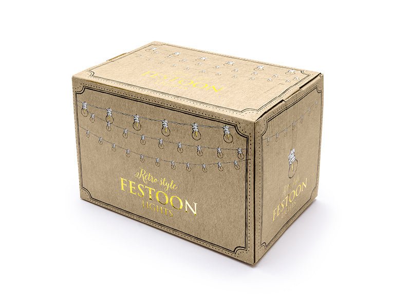 Festoon LED lampjes Retro op een witte draad met 10 heldere lampjes, warm gele kleur van het licht, lengte van de draad ca. 5 m, lengte van de extra draad ca. 3 m. Lampjes kunnen met maximaal 5 sets aan elkaar gekoppeld worden. Geschikt voor zowel binnen- als buitengebruik. Bevatten een EU stekker.