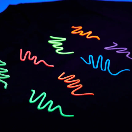 Hoog gepigmenteerde, permanente Neon UV textielverf voor langdurige, opvallende ontwerpen. Alle 8 opvallende kleuren schijnen overdag neon helder en geven 's nachts een immense gloed onder UV/zwart licht. Geef kleding, accessoires en meer een nieuw leven door oogverblindende ontwerpen te maken met onze levendige en fluorescerende rode, groene, oranje, blauwe, gele, roze, paarse en onzichtbare textielverf. Deze acht ongelooflijke kleuren zullen je kunstwereld op zijn kop zetten.