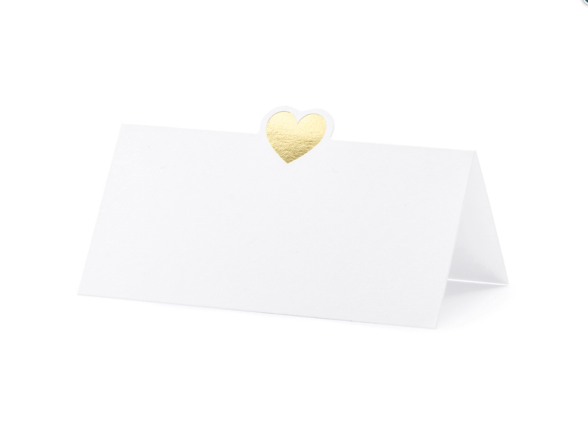 Inhoud: Plaats kaarten gemaakt van wit papier met gouden metalen hart, grootte na het monteren van ca.. 10 x 5 cm. (1 PKT / 10 st.)