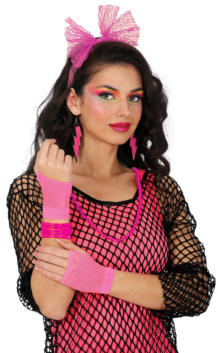 Ga voor een opvallende retrolook met deze felroze neon accessoireset in echte jaren 80 stijl. Ideaal voor themafeesten, carnaval of foute party’s.