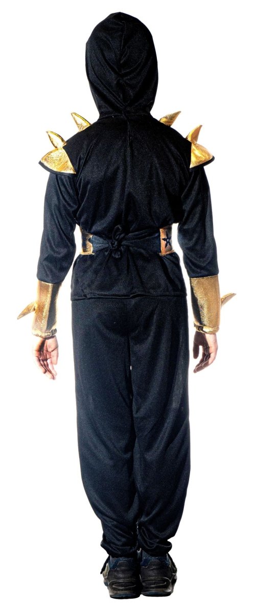 Dit gouden ninja-kostuum bestaat uit een top met kap, broek, masker en riem. Een compleet verkleed- of themakostuum. Gemaakt van 100% polyester.