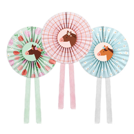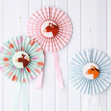 Decoratieve rozetten Paarden van papier, met lint, kleurenmix, diameter na montage ca. 35 cm, 3 stuks