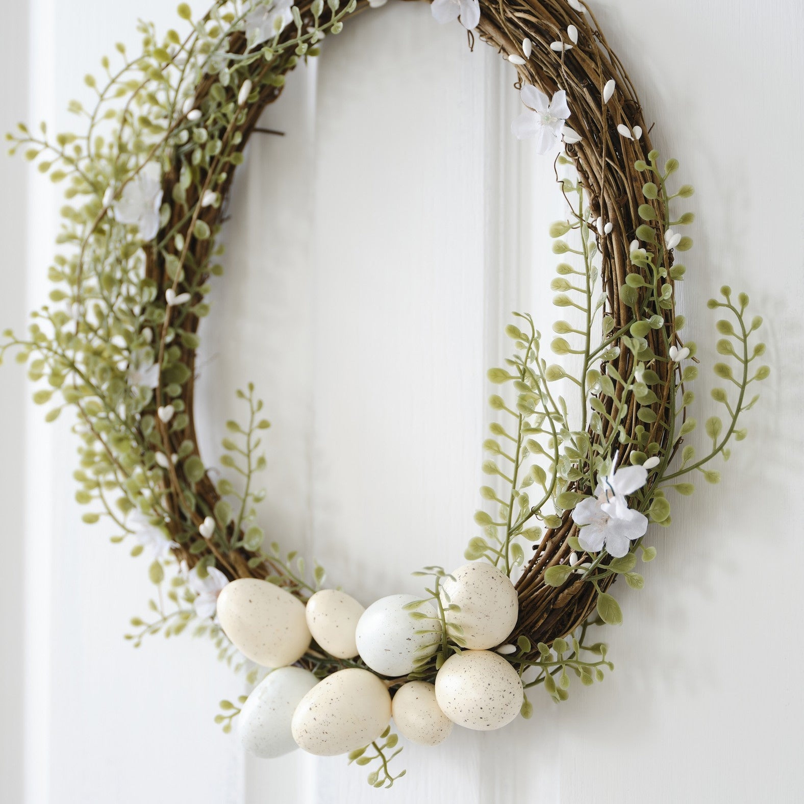 Deze prachtige eivormige lentekrans heeft een mix van kunstmatige gespikkelde eieren en bladeren - een werkelijk prachtige toevoeging om jaar na jaar in je huis te hangen.