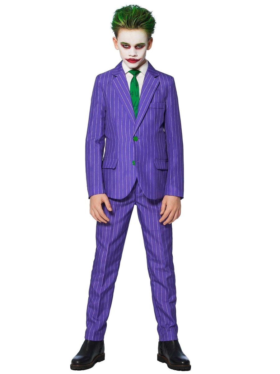 Of je kleine jongen The Joker™ nu kent uit een film, een stripboek of een videogame, één ding is zeker: je zult je kleine jongen laten lachen als de schurk met dit officiële The Joker™ pak. Het is geweldig voor vele gelegenheden, zoals verkleedfeestjes en Halloween. De outfit bestaat uit een jasje, een broek en een veilige clip-on stropdas. De broek heeft een verstelbare tailleband voor een comfortabele en stijlvolle pasvorm.