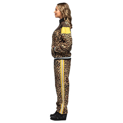 Dit lekker foute bruine trainingspak in luipaard print is een opvallend old school gabber kostuum voor Carnaval of een themafeest. De Brown Leopard babe Shell suit voor vrouwen in maat S bestaat uit een jasje en broek met handige zakken en past perfect in de 90’s stijl.