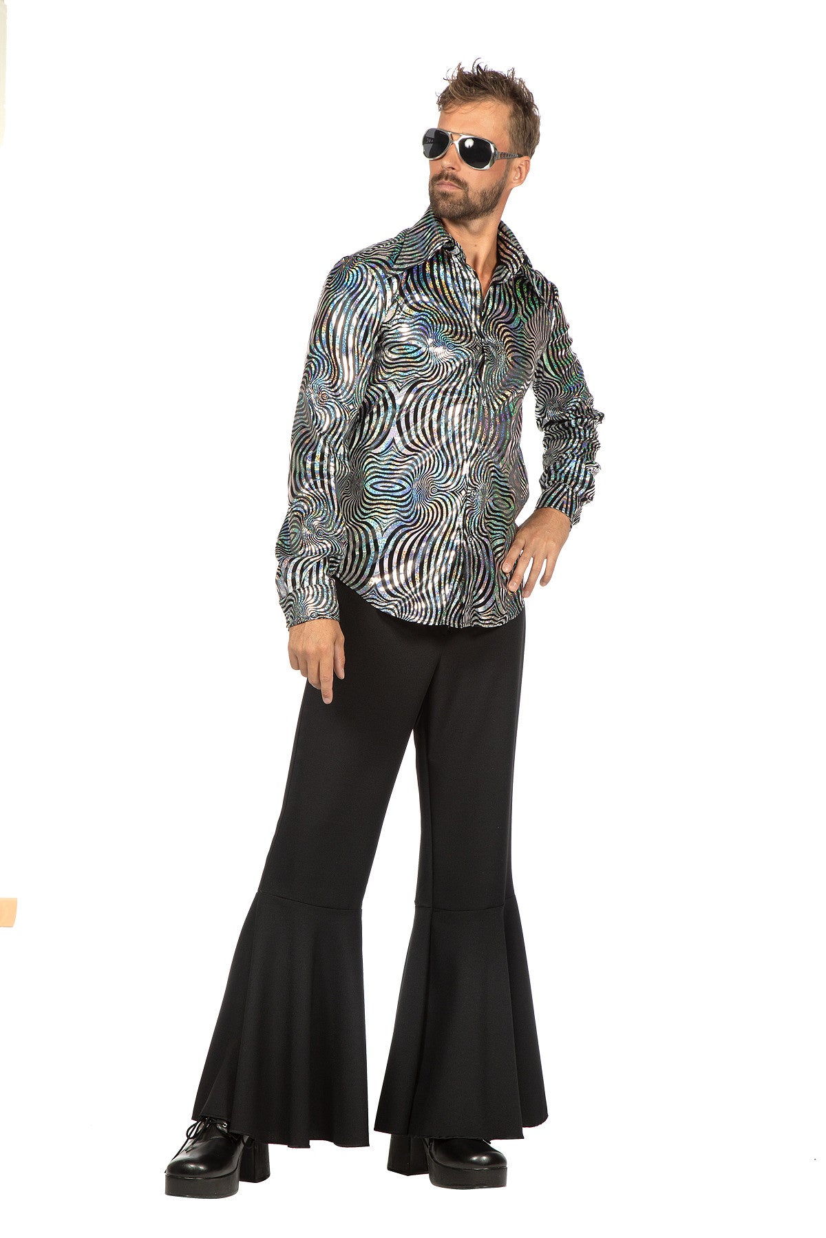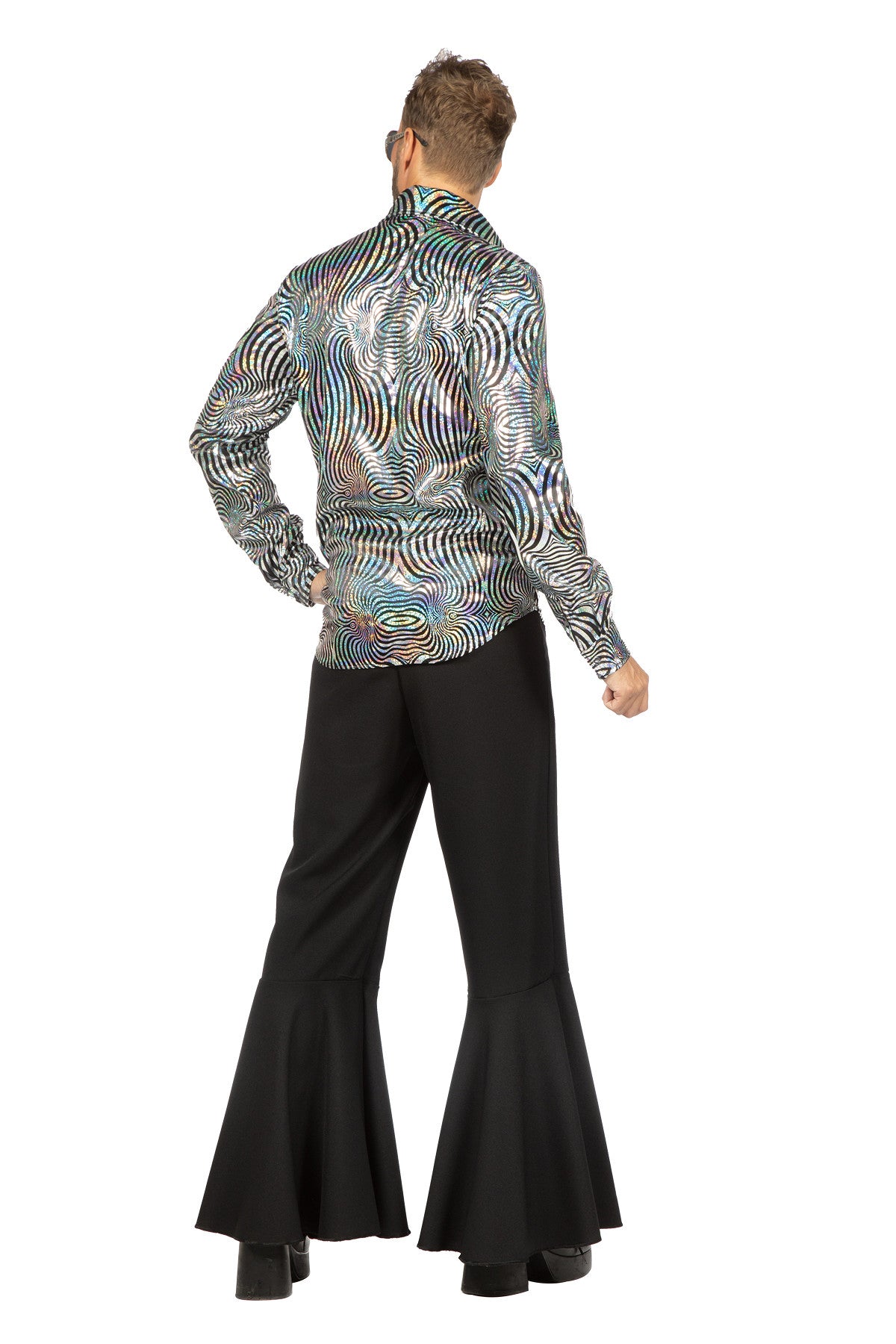 Glanzende zilveren disco blouse, ideaal voor feestjes, thema-avonden of carnaval. Perfect voor wie wil opvallen met een feestelijke, opvallende look.