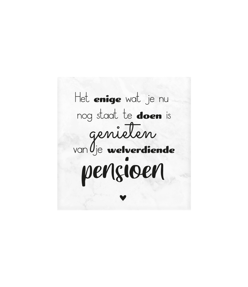 Paper Dreams heeft een leuke collectie marmeren onderzetters in het assortiment waaronder marmeren onderzetters - pensioen. Het praktische nut en het leuke design maken deze onderzetters tot een perfect cadeau artikel! De onderzetters zijn 10 bij 10 centimeter.