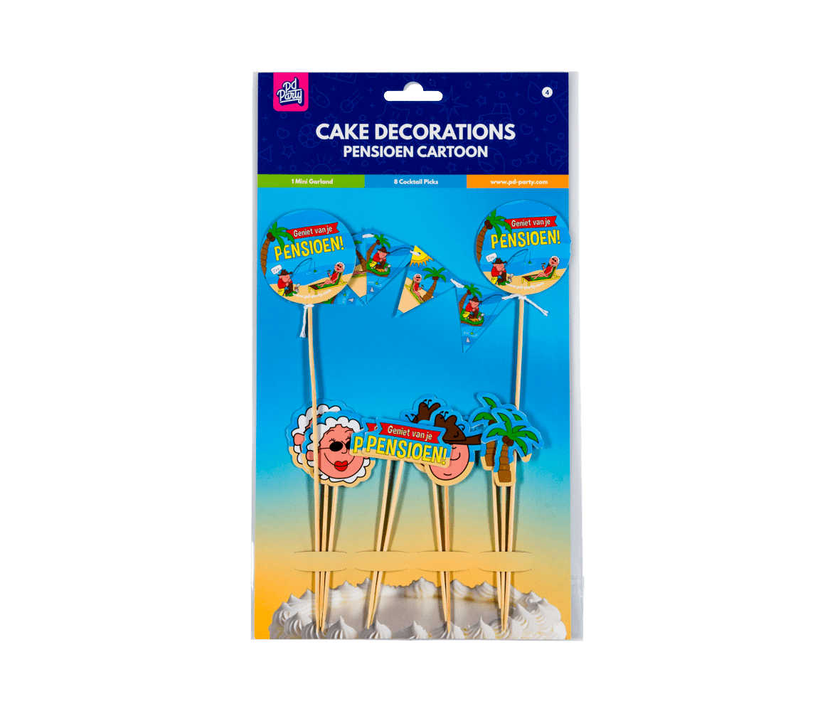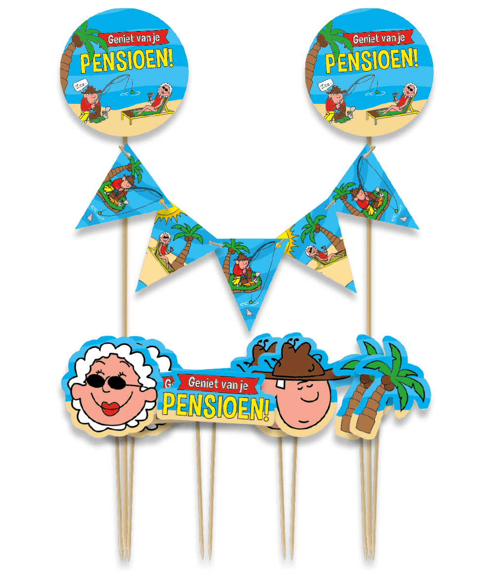 Maak van elke taart een ware blikvanger met deze cake decorations Pensioen! Gaat er iemand met pensioen dan is dit de perfecte decoratie in een taart. De prikkers zijn eenvoudig in de taart of cake te plaatsen voor een opvallend effect.