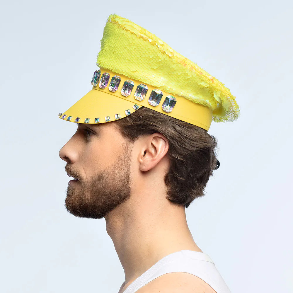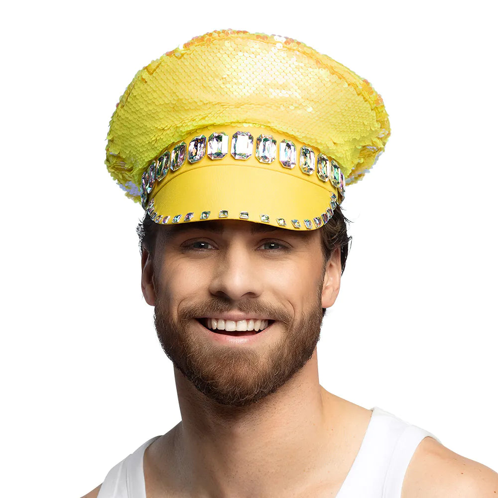 Maak je festivallook helemaal af met deze opvallende gele hoed met omkeerbare pailletten. Door de pailletten de andere kant op te strijken veranderen ze van kleur. Ook voor carnaval of Pride is deze bling bling hoed het perfecte accessoire. Let's get the party started!