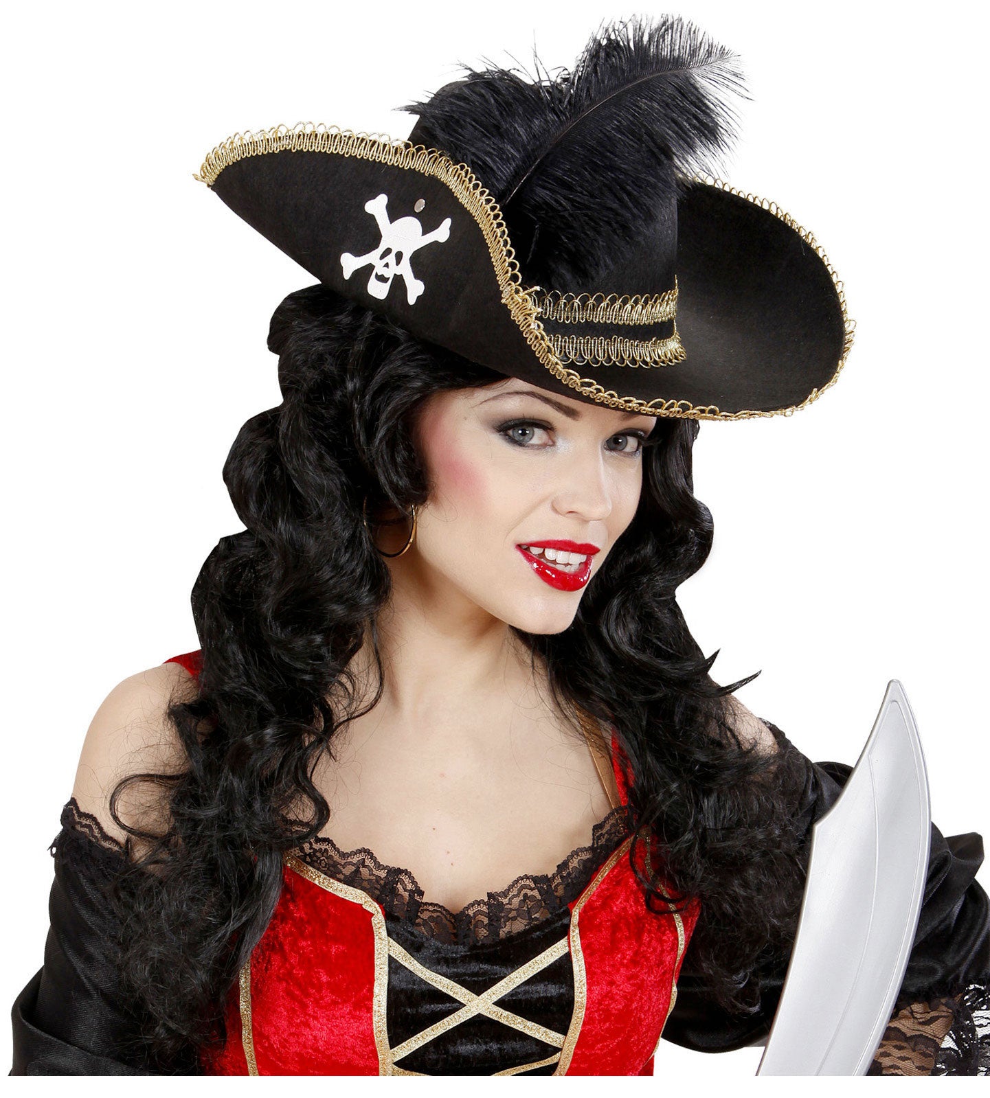 Omschrijving: piratenhoed met schedel en verenvilt Materiaal: 100% polyester, bevat niet uit textiel bestaande delen van dierlijke oorsprong Wasinstructies: niet wassen, bleken niet toegestaan, niet in de droger drogen, niet strijken, niet chemisch reinigen