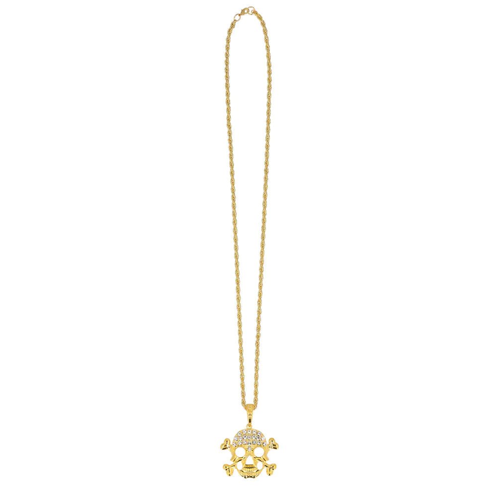 Deze stoere gouden ketting in de vorm van een skull is afgewerkt met diamantjes. Het is een matchend accessoire voor bij je skeletten kostuum, maar kan in feite bij elk Halloween of piraten kostuum.