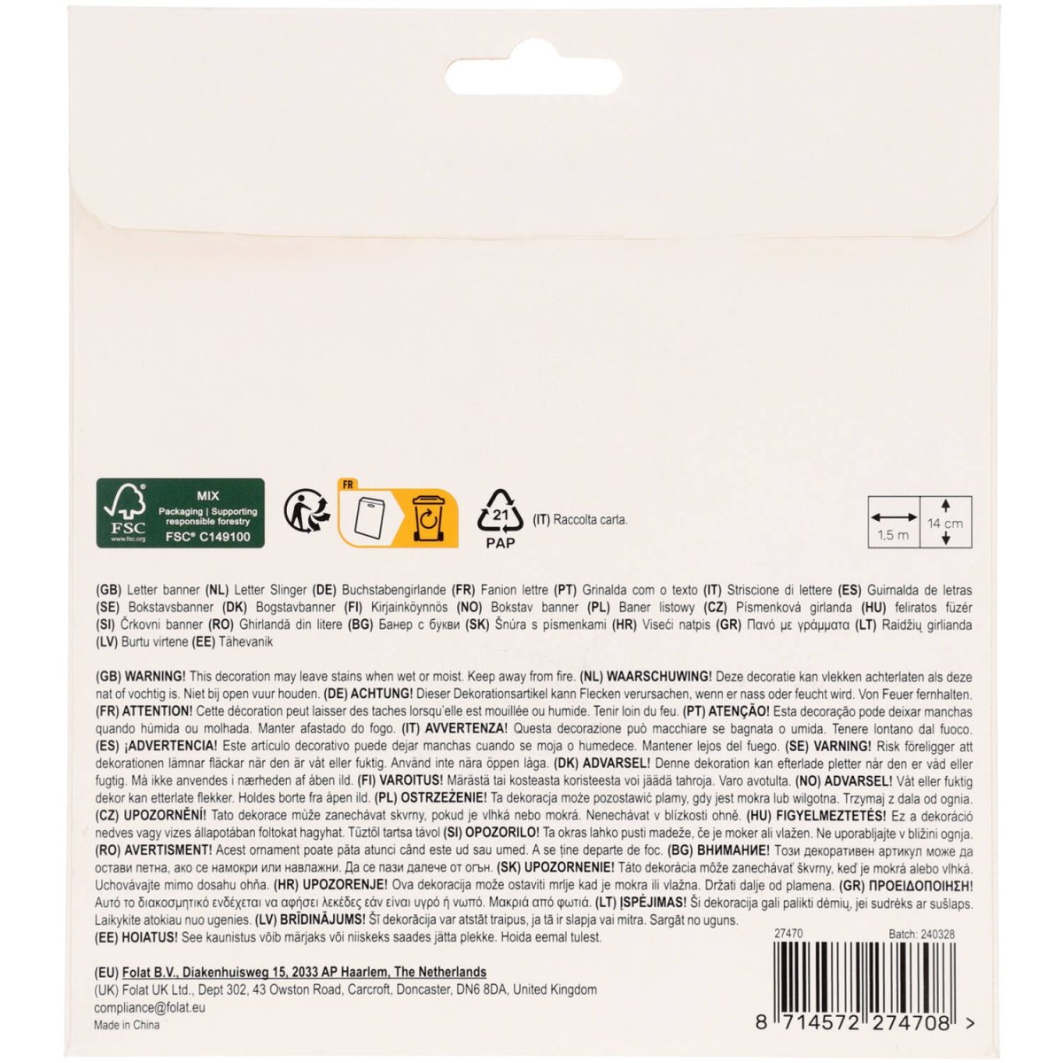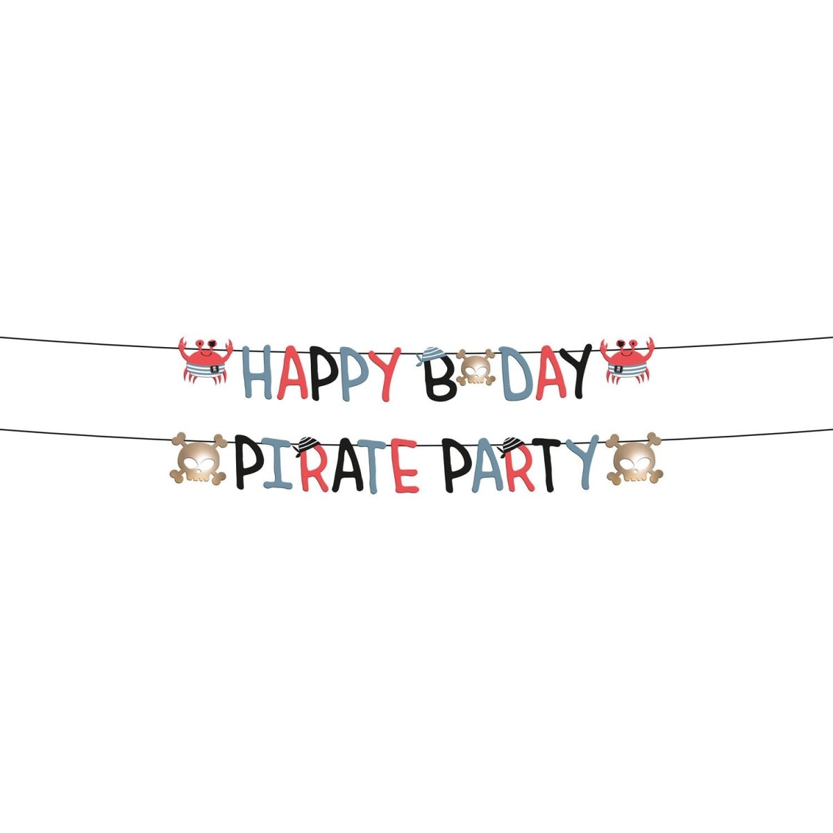 Laat zien wie de echte piraten zijn! Letterslinger Set - Pirate Party - 1,5 meter. Inhoud: 1 letterslinger uit 2 delen. Bijvoorbeeld te gebruiken tijdens de volgende feestgelegenheid/feestgelegenheden: Kinderfeestje, Verjaardag. De slinger bestaat uit twee delen: een slinger met de tekst "HAPPY BDAY" (ongeveer 14 cm hoog) met aan weerszijden 2 krabbetjes en een doodskop en een slinger met de tekst "PIRATE PARTY" (ongeveer 14 cm hoog) met aan weerszijden 2 doodskoppen. Beide slingers zijn 1 meter lang. De krabben, doodskoppen en de letters kunnen heen en weer worden geschoven over het zwarte lint. Deze Letterslinger set hoort bij de Pirate Party collectie van Folat. Dit artikel is gemaakt van papier.
