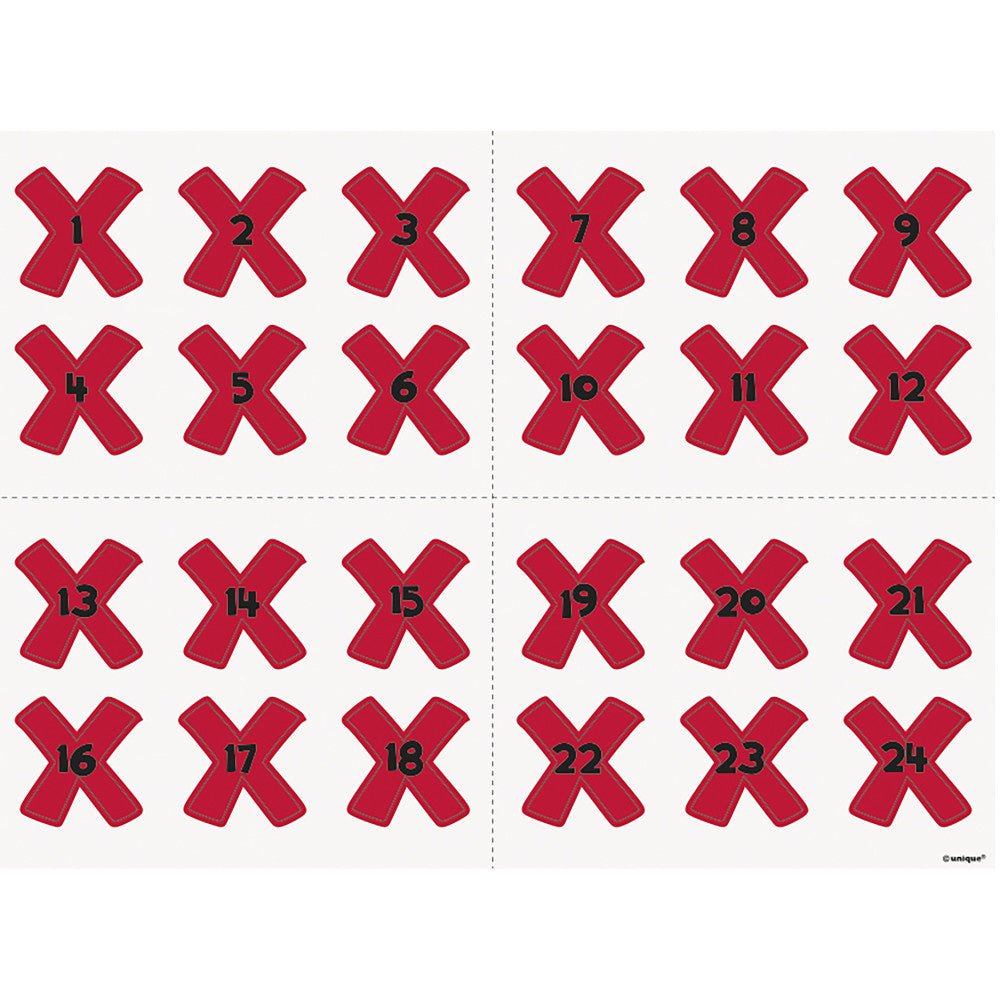 Inhoud: vel voor aan de muur, blinddoek en 24 stickers