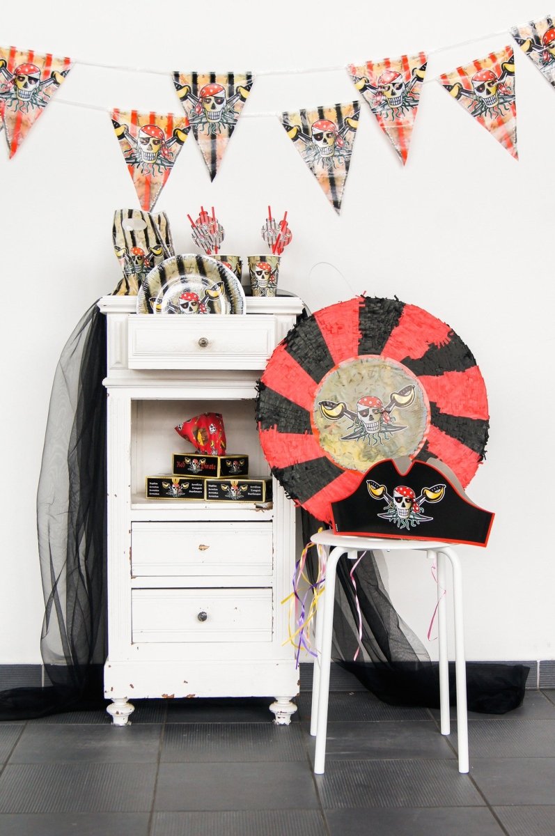 Rode Piraat piratensteken - 8 stuks. Inhoud: 8 papieren hoedjes, kleur: Rood. Bijvoorbeeld te gebruiken tijdens de volgende feestgelegenheid/feestgelegenheden: Carnaval, Themafeest, Halloween. Deze hoedjes zijn 18 cm breed en 1cm hoog. Het artikel is gemaakt van karton.