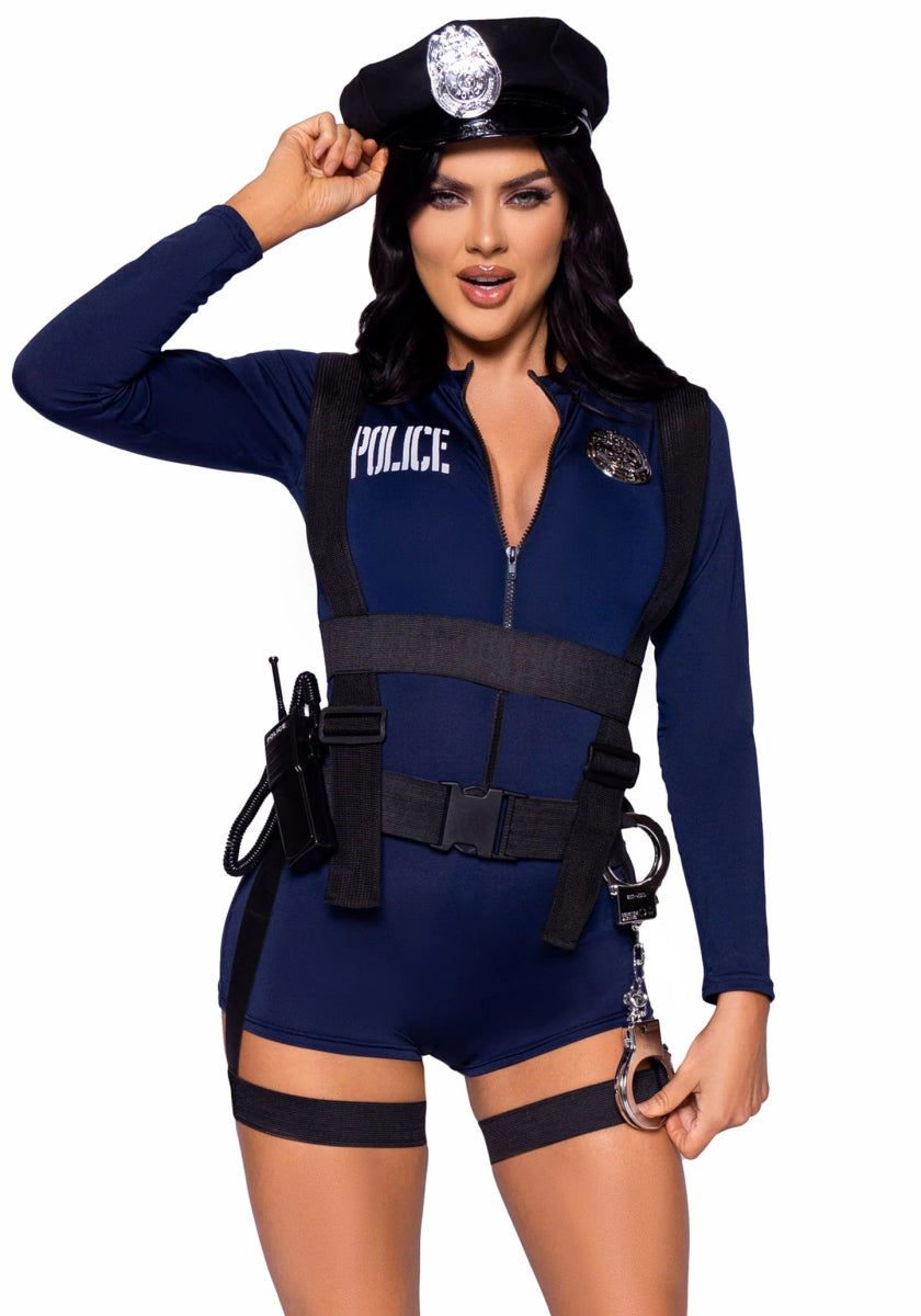 Laat je sexy gedachten de vrije loop in het Flirty Politiekostuum van Leg Avenue! Deze donkerblauwe bodysuit met ritssluiting aan de voorkant, lange mouwen en een pin-on badge zorgt ervoor dat jij het middelpunt van de aandacht wordt. Het harnas met kousenband, handboeien, speelgoed-walkietalkie en de bijpassende politiepet maken de look compleet, waardoor je de perfecte keuze hebt voor carnaval, Halloween of een themafeest. Klaar om de regels te overtreden in stijl? 💋💼