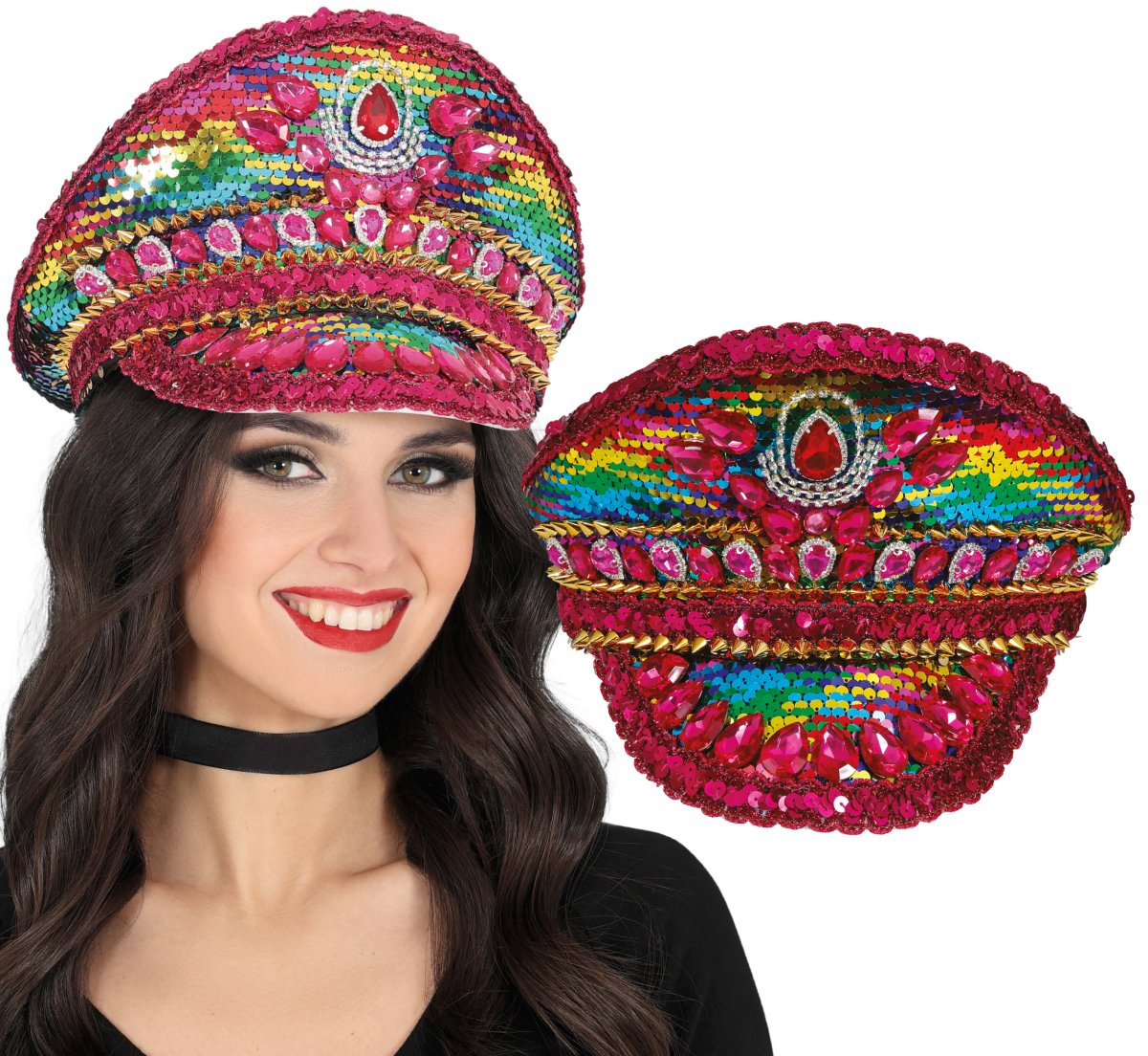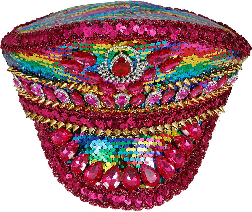 Laat je opvallen met deze feestelijke politie pet in regenboogkleuren, afgewerkt met fonkelende steentjes en een roze band. Een perfecte combinatie van stoer en speels, ideaal voor feesten en festivals.