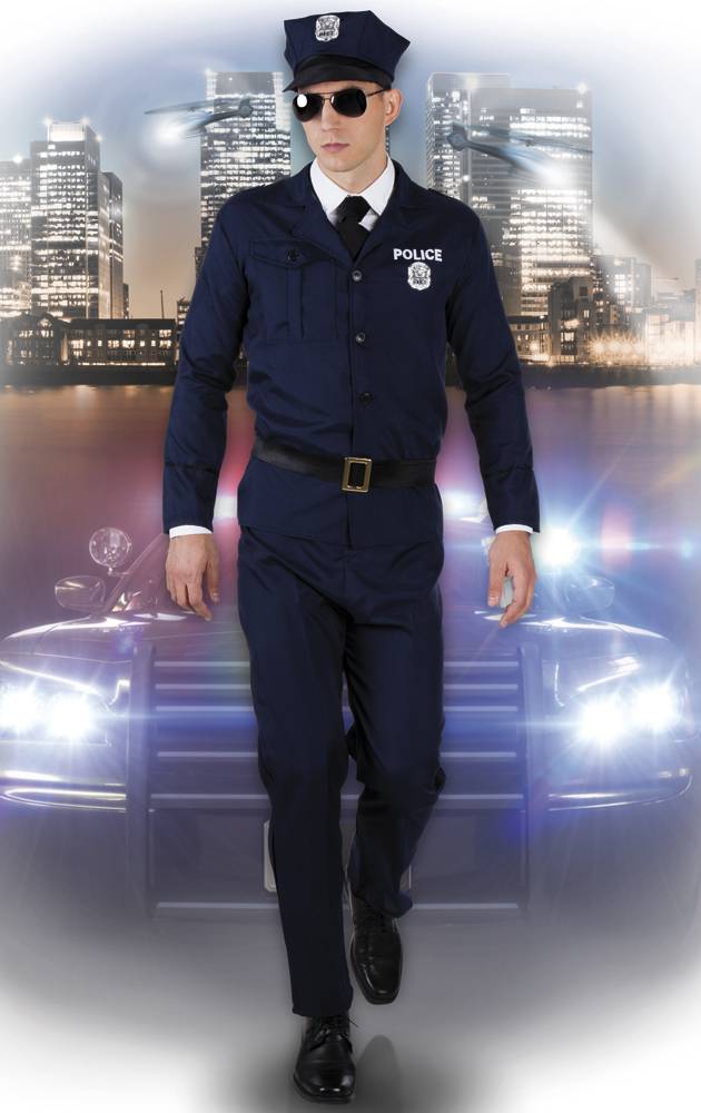 Inhoud: politie jas met badge, broek, riem en pet