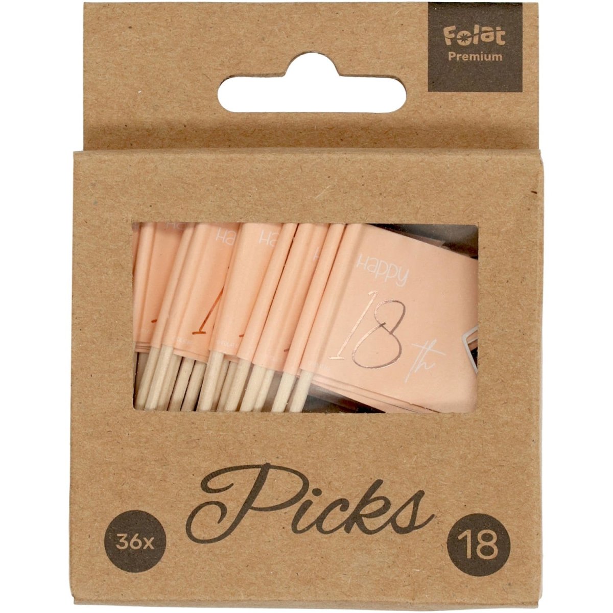 Prikkers Elegant Lush Blush 18 Jaar - 36 stuks. Inhoud: 36 prikkers. Kleur: Roze. Bijvoorbeeld te gebruiken tijdens de volgende feestgelegenheid/feestgelegenheden: Verjaardag, Jubileum. Afmetingen: 6,5 cm hoog. Het artikel is gemaakt van bamboe.