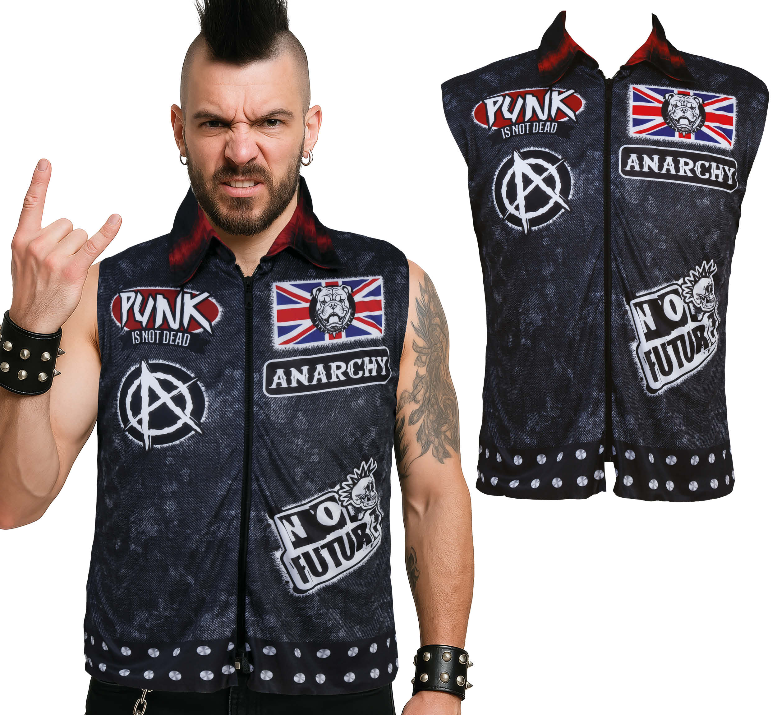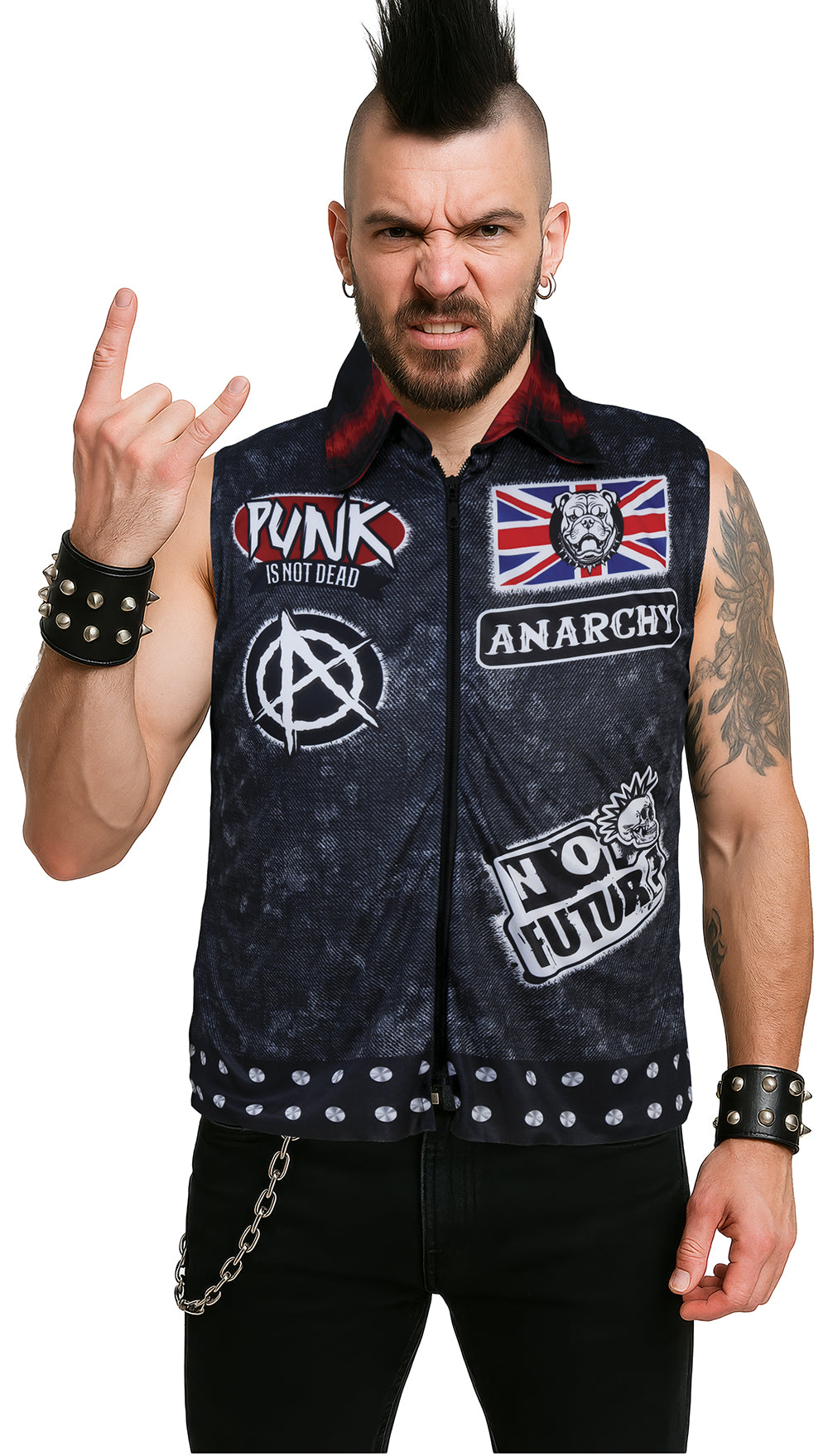 Geef je outfit een stoere en rebelse look met dit zwarte punkvest. Ideaal voor themafeesten, concerten, carnaval of als opvallend accessoire bij elke punk- of rockstijl.