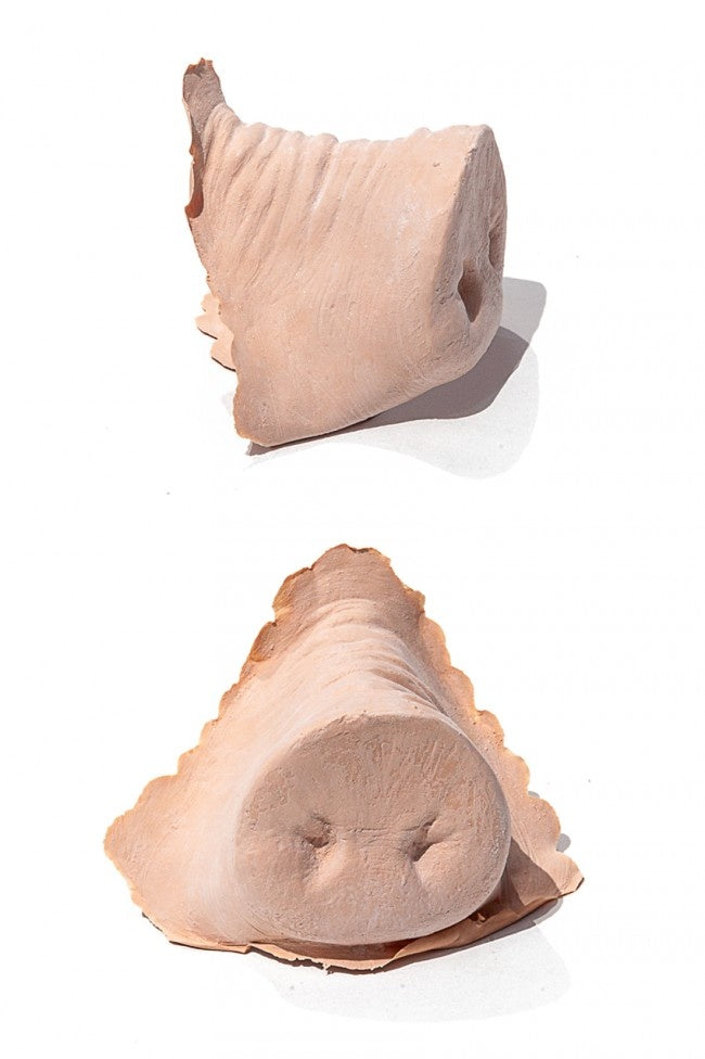 - Voorbereiding van de prothese: Kleur de delen die huidkleurig moeten worden (behalve de randjes) lichtjes rood om een natuurlijke doorbloeding te suggereren. Gebruik hiervoor Grimas Eyeshadow/Rouge en breng dit aan met een make-upsponsje of poeder-/rougeborstel.