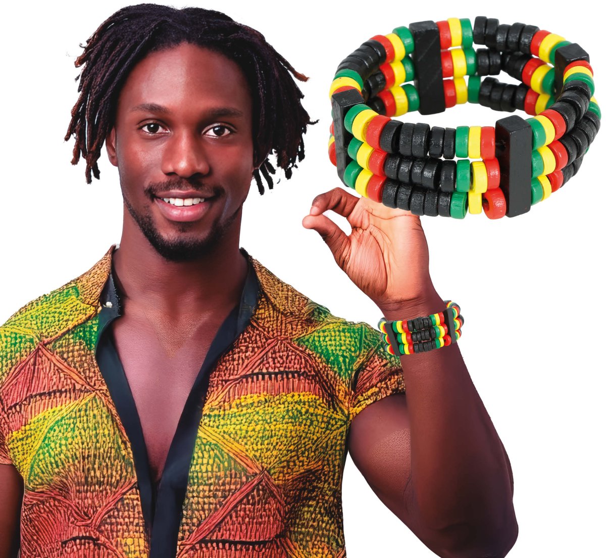 Trendy armband in Rasta-stijl, gemaakt van hout in de kenmerkende kleuren zwart, geel en groen. Perfect om je outfit een vrolijke en kleurrijke touch te geven, of als accessoire voor themafeesten en festivals.