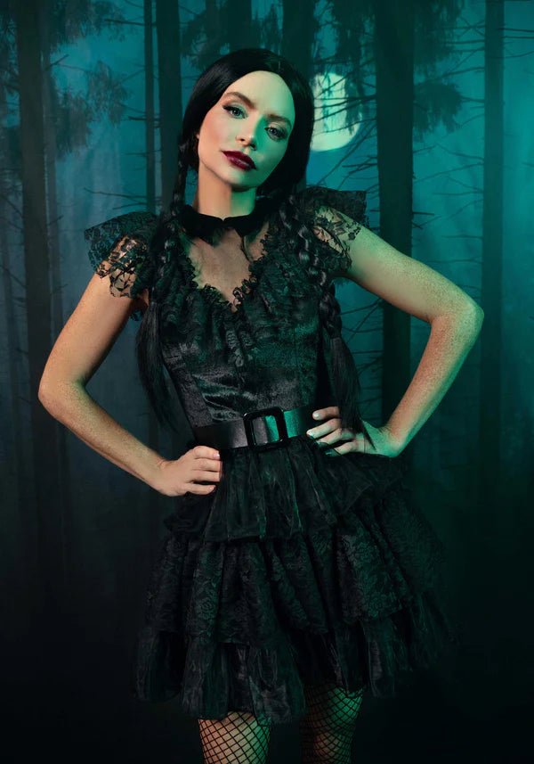 Stap in een wereld vol betovering met het 3-delige Raving Rebel kostuum! Dit unieke ensemble bestaat uit een fluwelen en kanten jurk, een etherische organza gelaagde rok, een taille-cincher riem en een gedurfde mesvormige haarclip. Of je nu Halloween viert of een statement wilt maken tijdens carnaval, dit kostuum laat je stralen met een mix van elegantie en rebellie. 🔪💃
