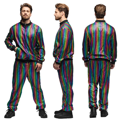Dit kleurrijke en vrolijke trainingspak brengt de funky vibes van de discotijd tot leven met zijn levendige regenboogkleuren en retro design. Of de shell suit nu bedoelt is om de dansvloer te veroveren op een feestje of als opvallend 80’s kostuum voor Carnaval, dit groovy kostuum is de perfecte keuze. Deze Rainbow dude Shell suit voor mannen in bestaat uit een matching jasjes en broek in een discobal design met handige zakken om kleine voorwerpen in op te bergen.