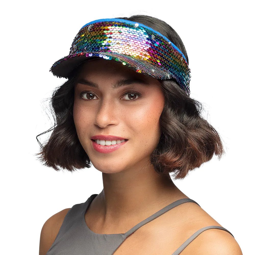 Deze opvallende zonneklep trekt direct de aandacht door de glanzende regenboog pailletten. Het maakt van elke outfit een feestje en is het perfecte accessoire voor Pride, een 90s feestje of een foute party.
