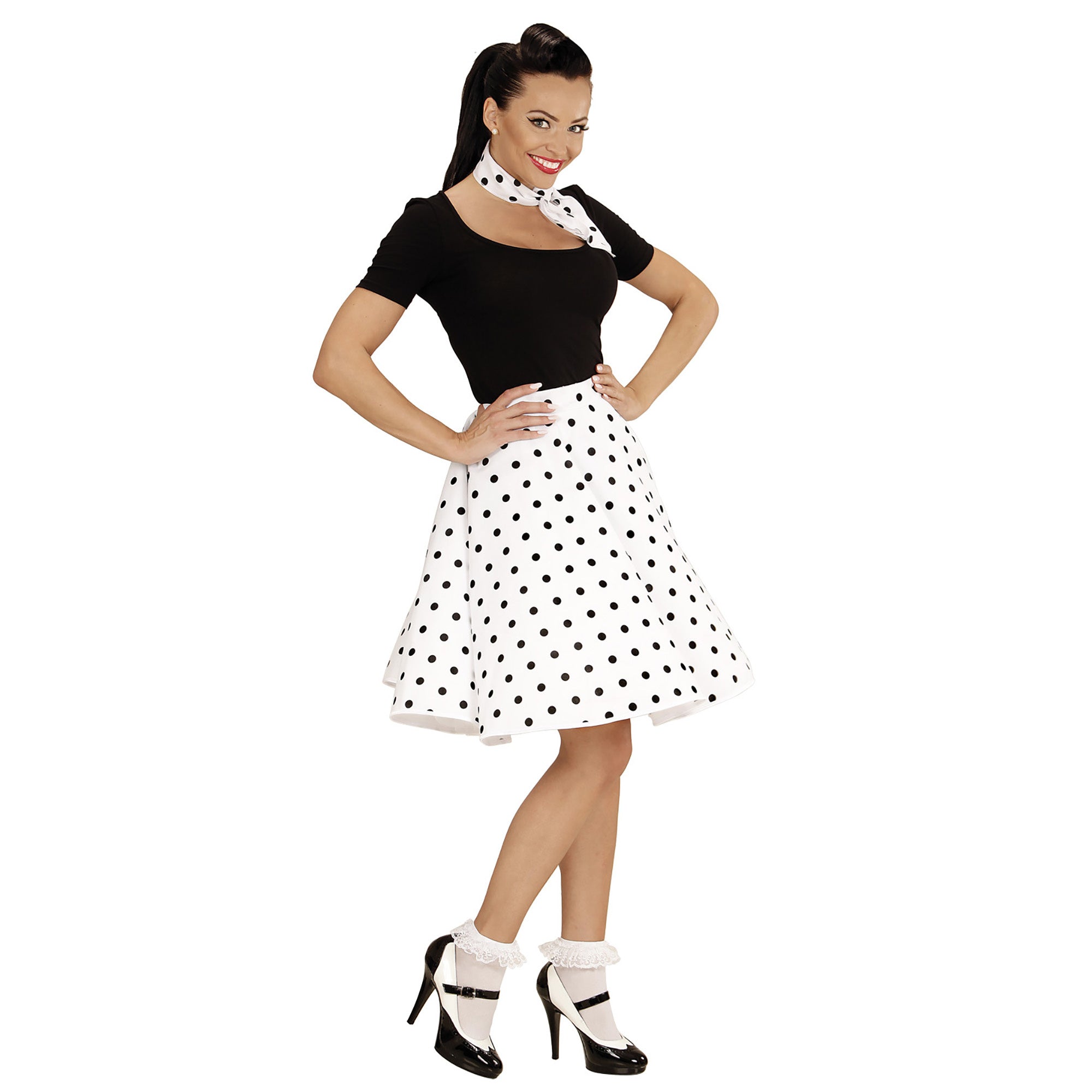 Omschrijving: witte jaren 50 polka dots rok & colsjaal