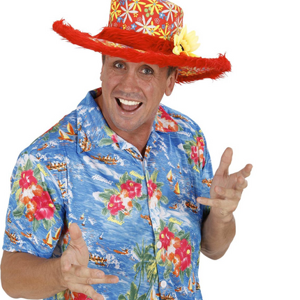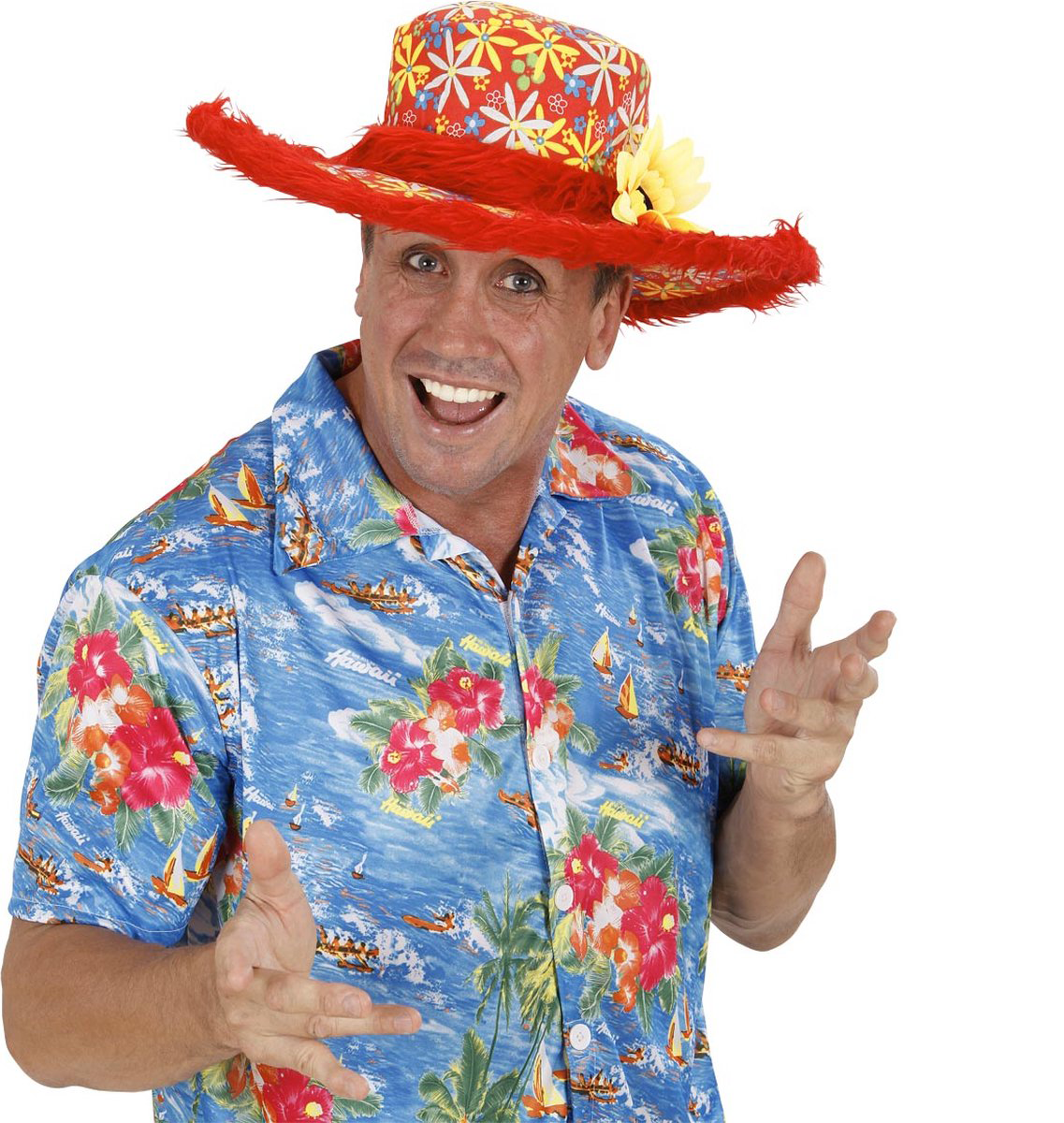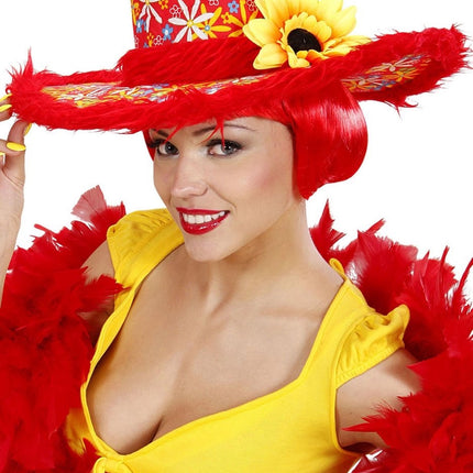 De versieringen zijn bevestigd aan de hoed met een ijzerdraad, verwerkt in het stof. De onderkant van de hoed en de versiering zijn gemaakt van rode haren. Een grote gele en oranje zonnebloem is bevestigd aan de zijkant van de hoed.