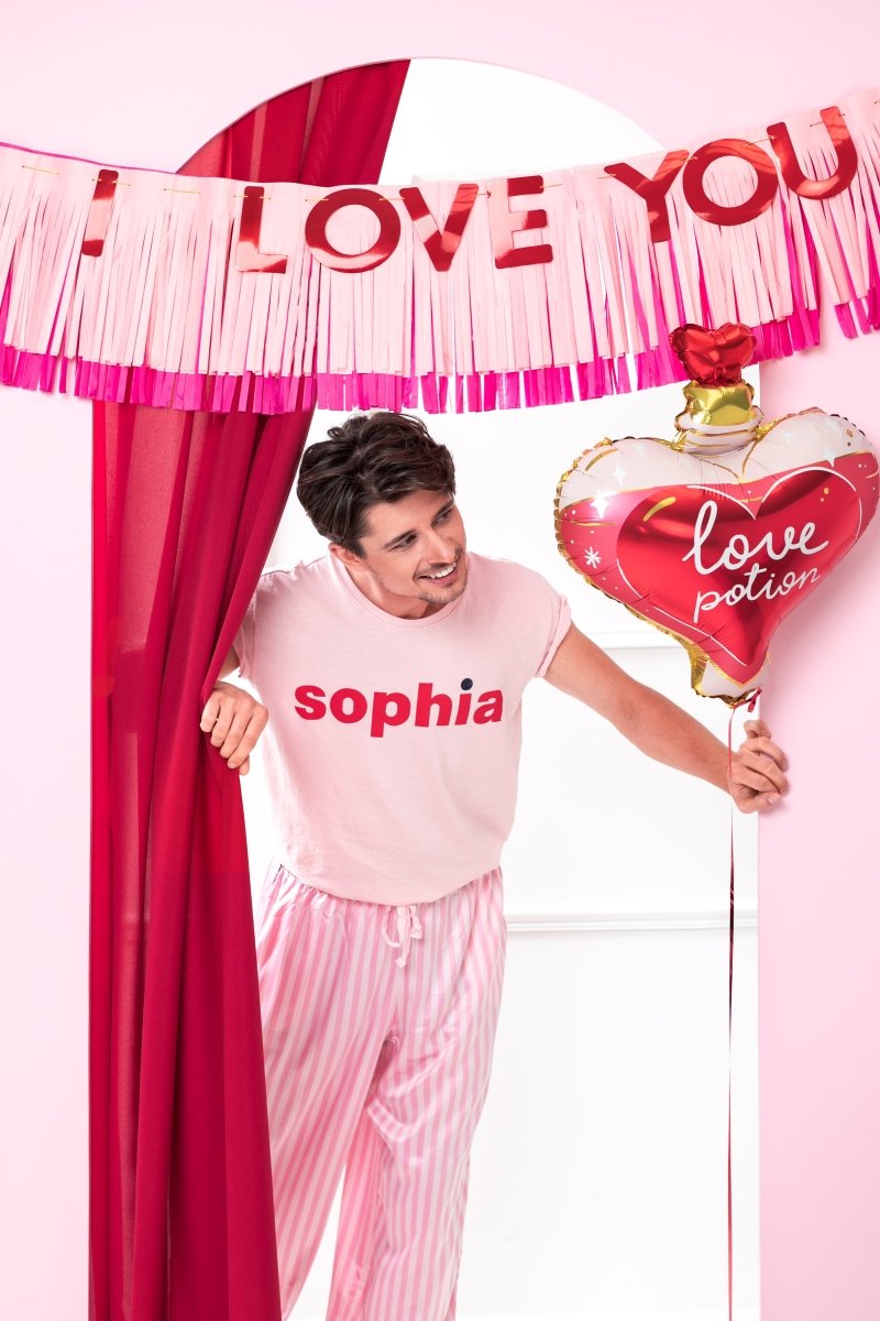 Banner I Love You gemaakt van tissue-papier franje in roze kleur en letters in metallic rode kleur, afmeting ca. 150 x 30 cm, lengte touw ca. 2,5 m.