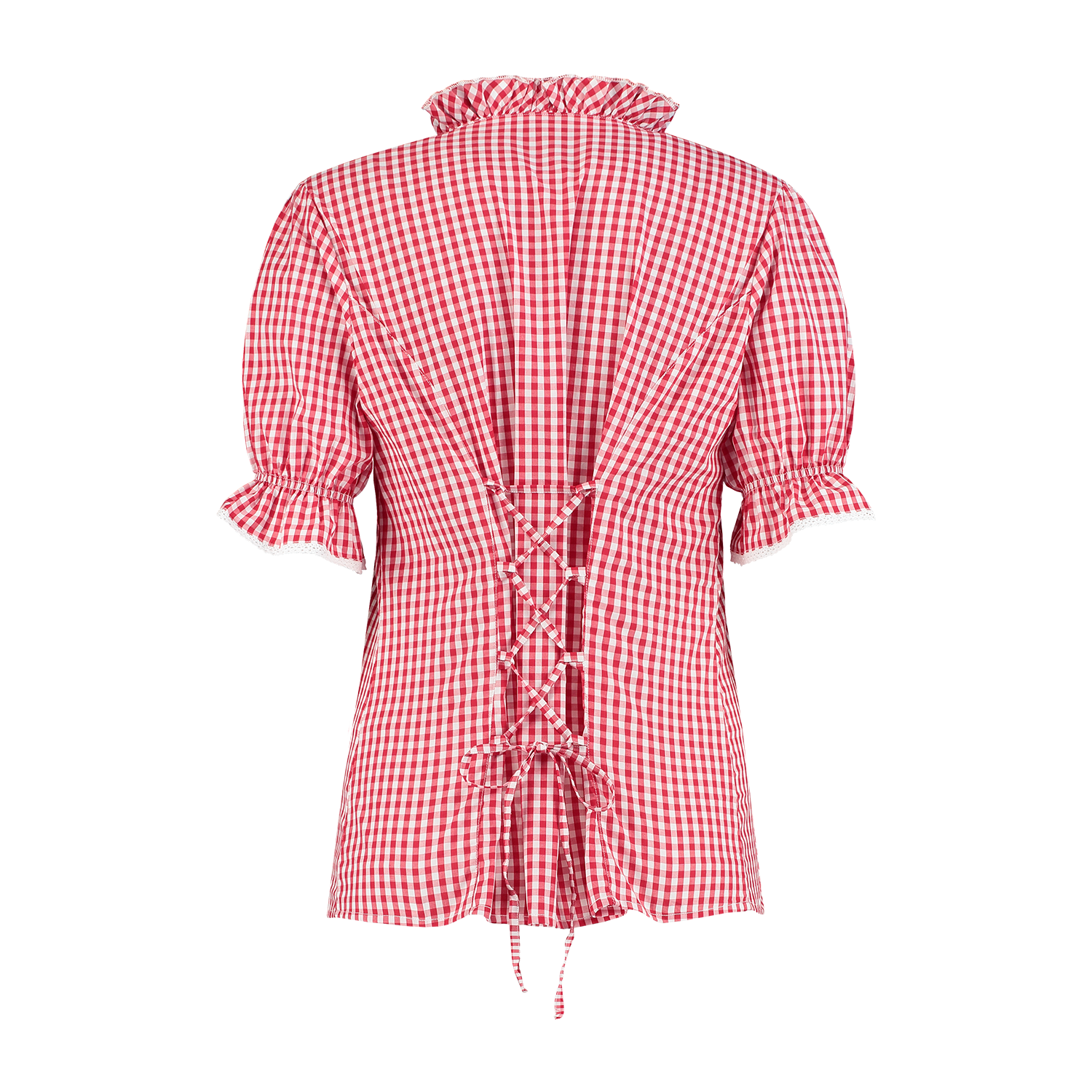 De blouse heeft traditionele knopen aan de voorkant en een vetersluiting aan de achterkant.