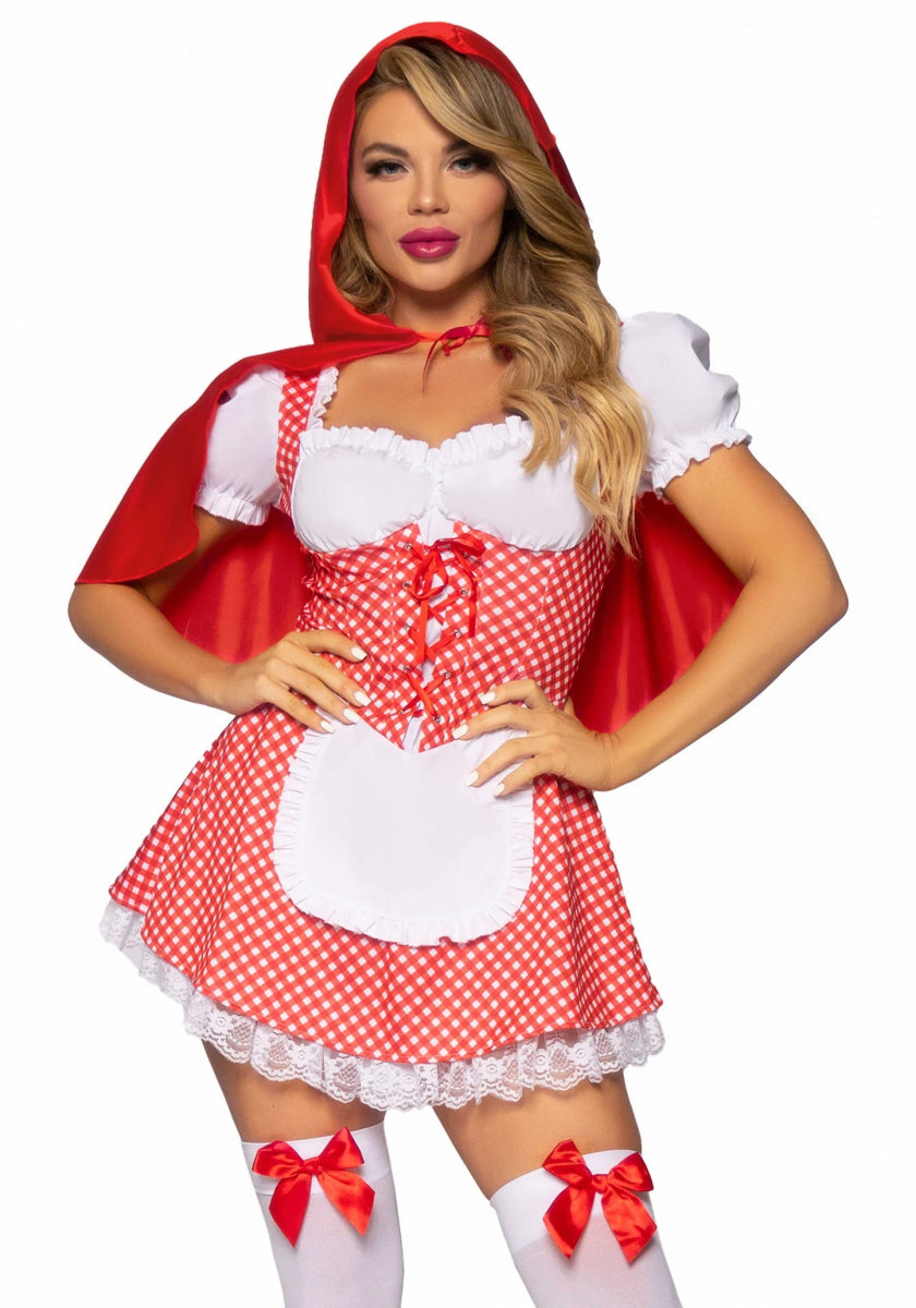 Stap het bos in met vertrouwen in het Roodkapje kostuum van Leg Avenue! Dit sprookjesachtige kostuum bestaat uit een charmante gingham-jurk met een gegolfde buste, korte mouwen, een veter aan de voorkant, een bijgevoegde schort en een cape met capuchon. Het is de perfecte outfit voor carnaval, Halloween of een sprookjesachtig themafeest! 🌹🐺