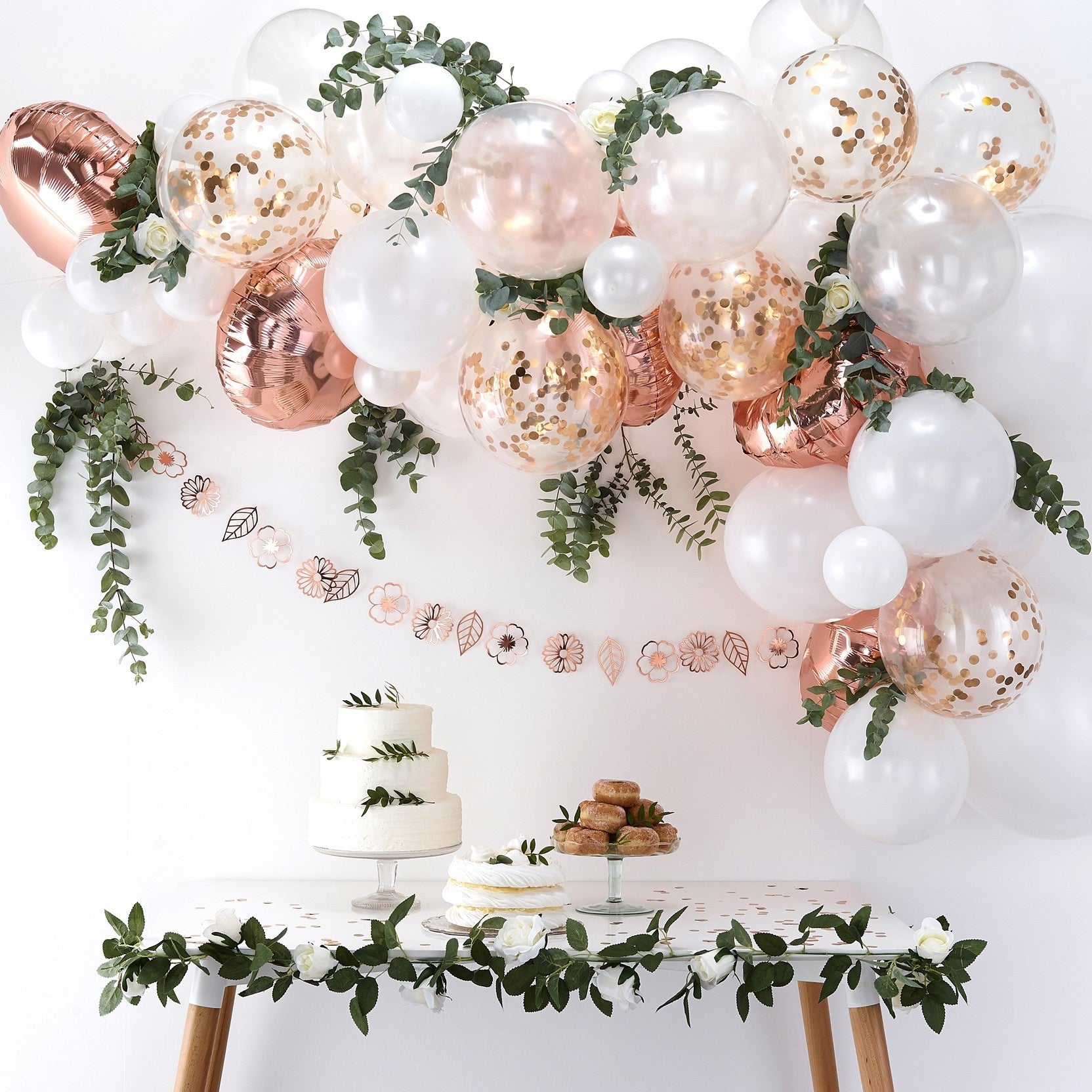 Deze roségouden ballonnenboog is een fantastische showstopper om uw gasten te verbazen. Hang hem eenvoudigweg aan de muur of aan een deuropening om een centraal punt in uw locatie te creëren en uw gasten aan het praten te krijgen.
