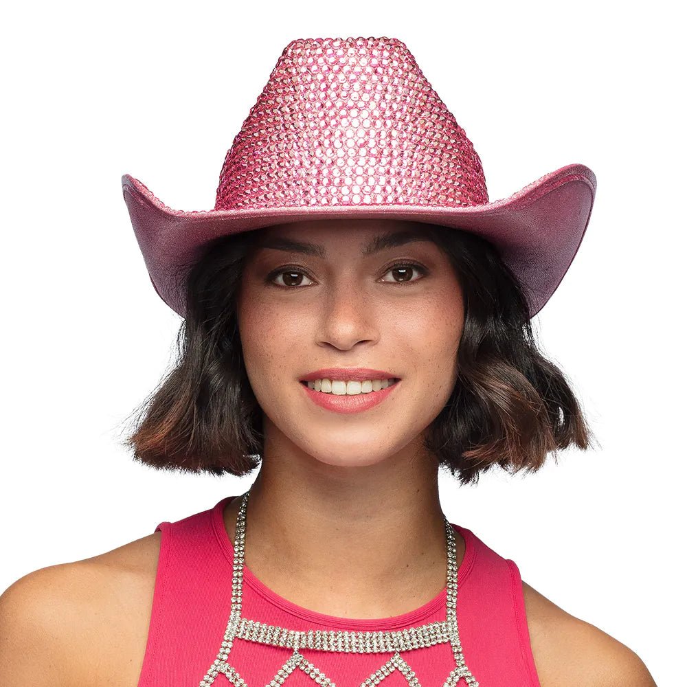 Deze opvallende cowboyhoed versierd met roze glitter steentjes is het perfecte accessoire om feestgangers te laten stralen op elk feest. Deze glamoureuze hoed voegt een vleugje western flair toe aan je festivaloutfit. Een must-have voor feestjes, concerten, festivals, vrijgezellenfeesten of een unieke cowboy outfit voor carnaval of een themafeest.